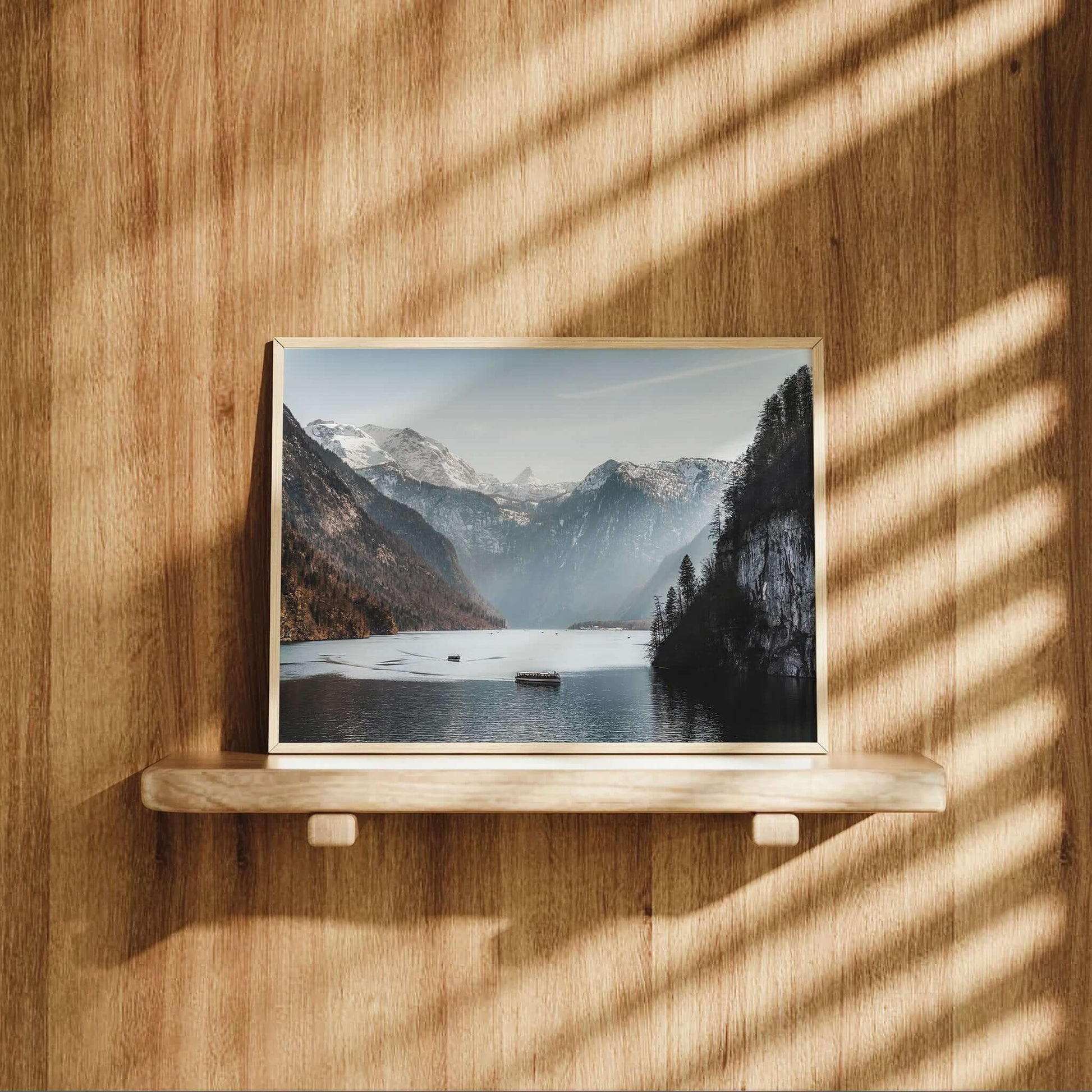 A majestic view of Königssee, one of Germany’s most iconic alpine lakes. This fine art photograph captures boats gliding through still, glacial waters between steep cliffs and snowy peaks. A timeless piece of the Berchtesgaden Alps, perfect for adding quiet scale and natural beauty to any room.