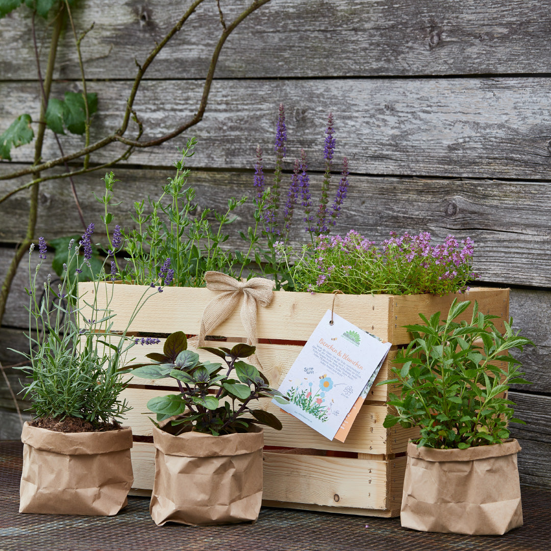 Die Pflanzen werden in der Holzkiste mit entsprechenden 'Setcards' geliefert. Mehr Informationen zu diesem Set und den enthaltenen Pflanzen findest du weiter unten auf dieser Seite. Sollte eine Pflanze kurzfristig nicht verfügbar sein, wird sie durch eine ähnliche Pflanze ersetzt.