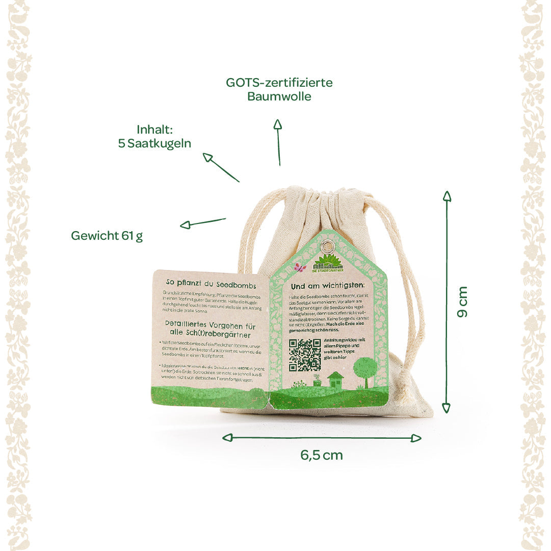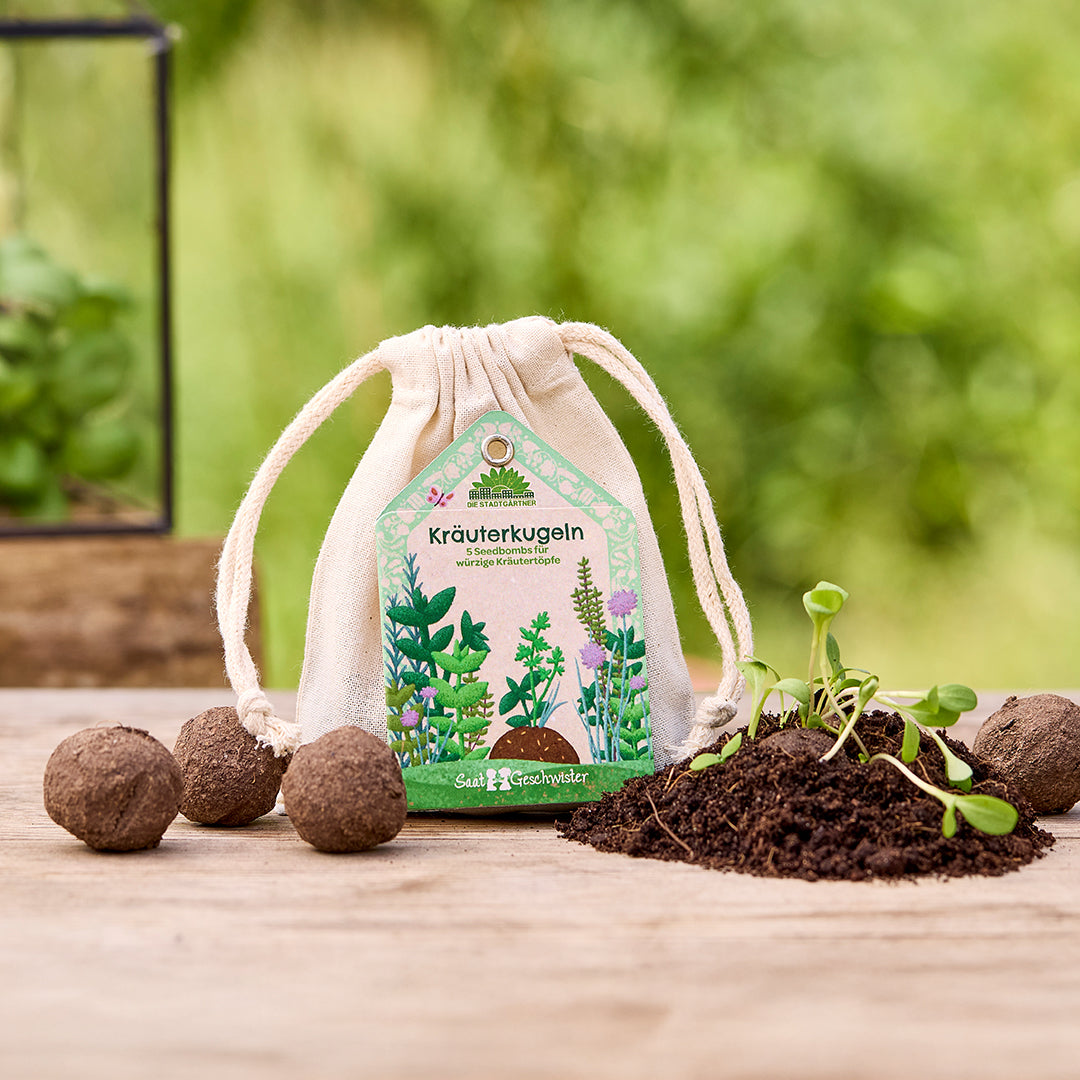 Nachhaltig: Die Saatkugeln werden einfach auf lockere Erde gelegt und regelmäßig gegossen – schon bald sprießen frische Kräuter. Das Säckchen besteht aus nachhaltiger, GOTS-zertifizierter Baumwolle und kann wunderbar wiederverwendet werden.