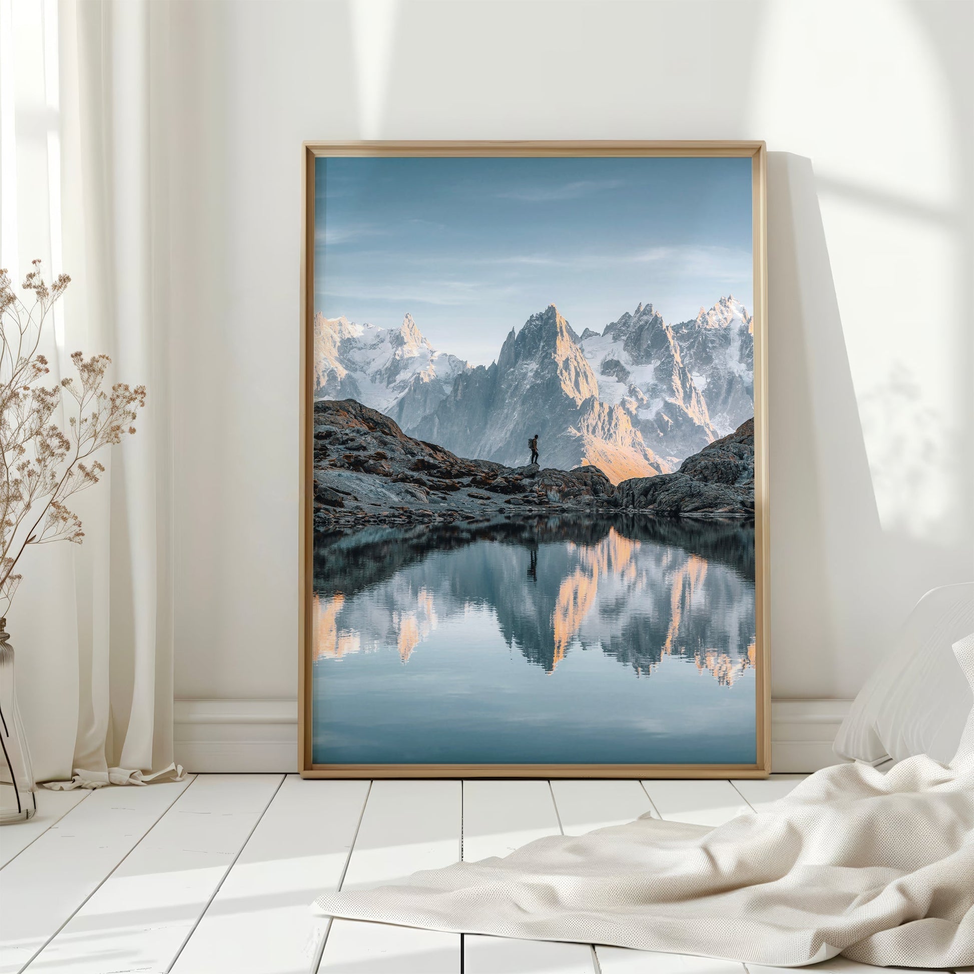Immerse yourself in the magic of Lac Blanc at sunset, as the Aiguilles de Chamonix glow in the golden light and reflect in serene alpine waters. A captivating piece for mountain and nature enthusiasts.