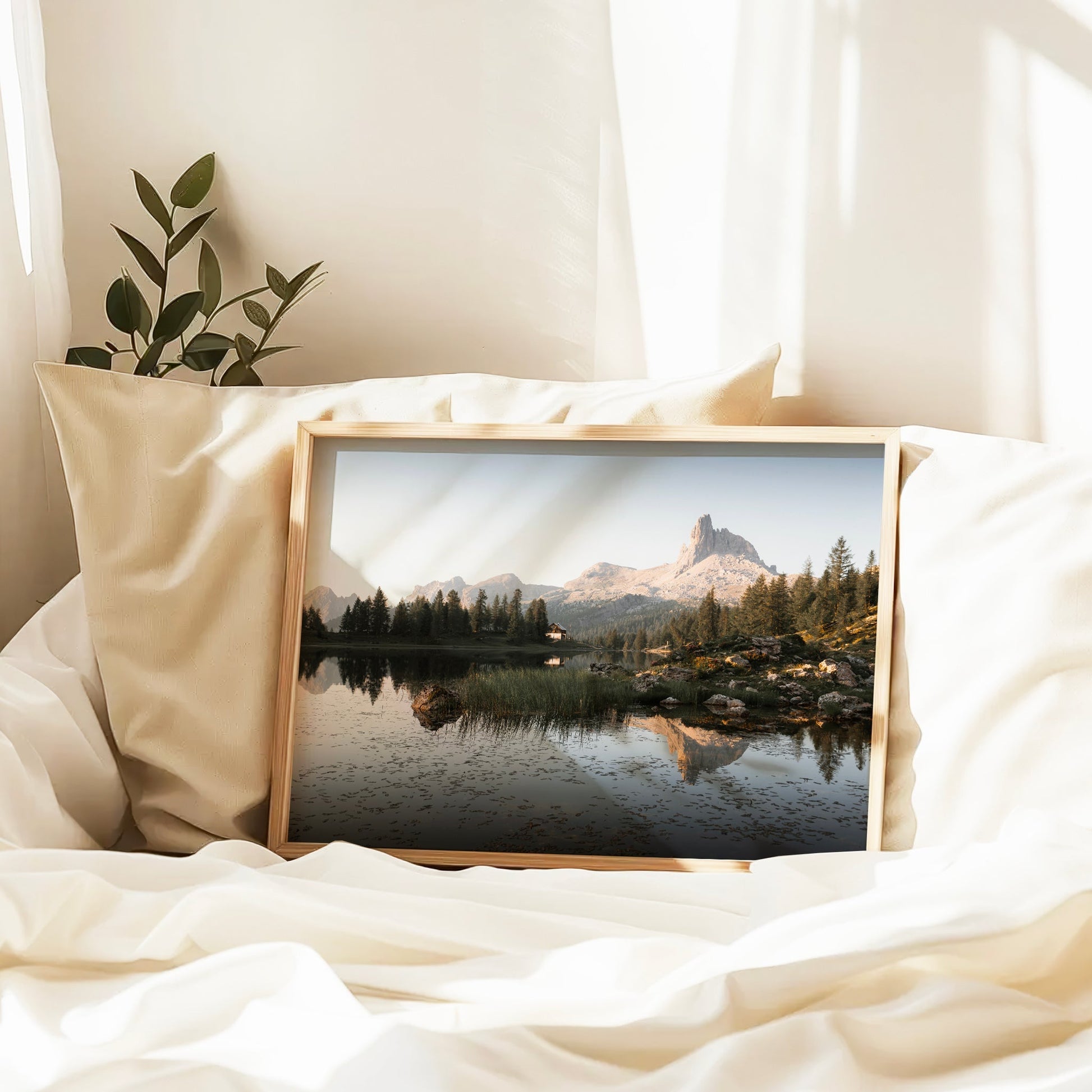 Experience the tranquility of Lago di Federa at sunrise—where glassy waters reflect the emerging light in a breathtaking Dolomites landscape. This high-quality photography print captures the stillness of nature, making it a perfect addition to any home, office, or studio.