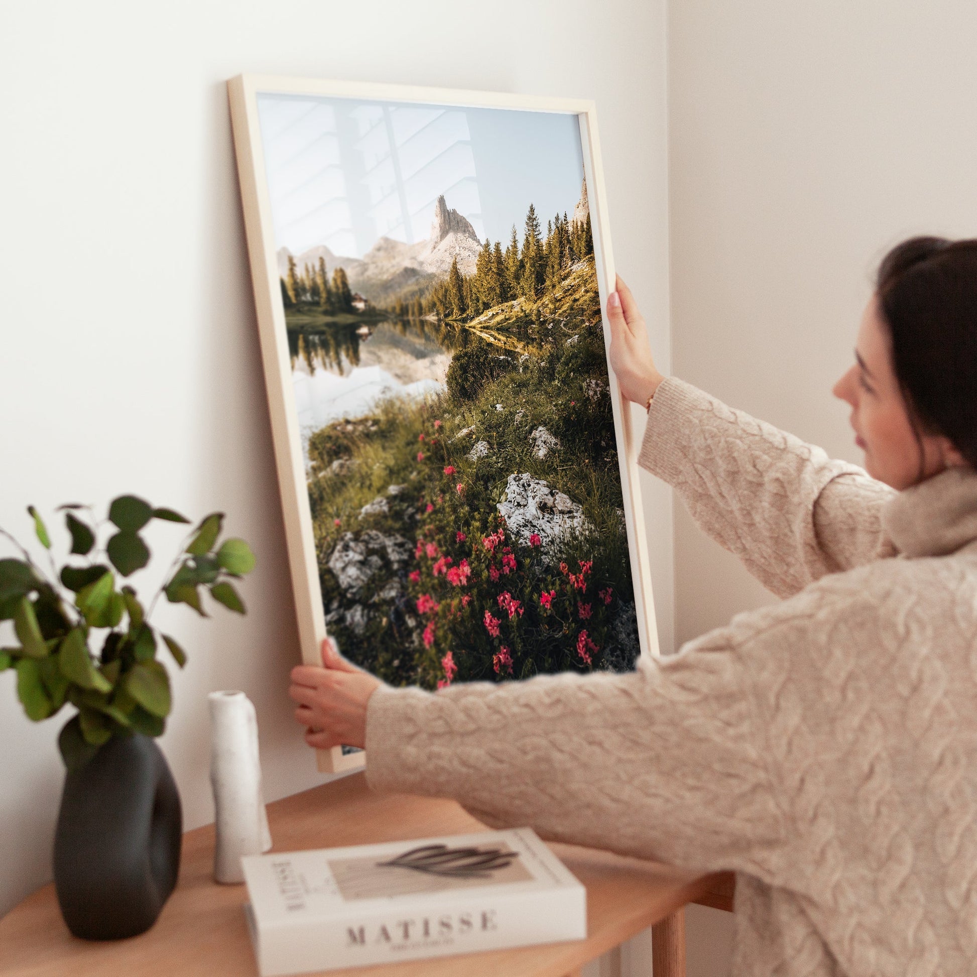 Capture the peaceful beauty of the Italian Alps with this fine art photograph of Lago di Federa. Shot at sunrise, the mirror-like lake reflects jagged Dolomite peaks while wild pink alpine flowers bloom in the foreground. A timeless print for nature lovers and mountain dreamers.
