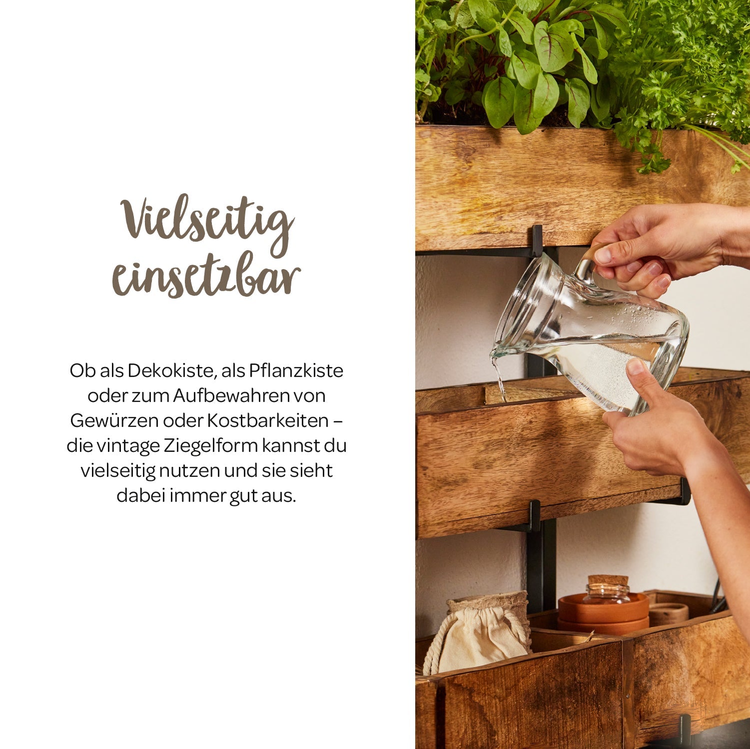 Vielseitig einsetzbar: Ob als Dekokiste, als Pflanzkiste oder zum Aufbewahren von Gewürzen oder Kostbarkeiten - die vintage Ziegelform mit zwei Kammern kannst du vielseitig nutzen und sie sieht dabei immer gut aus.