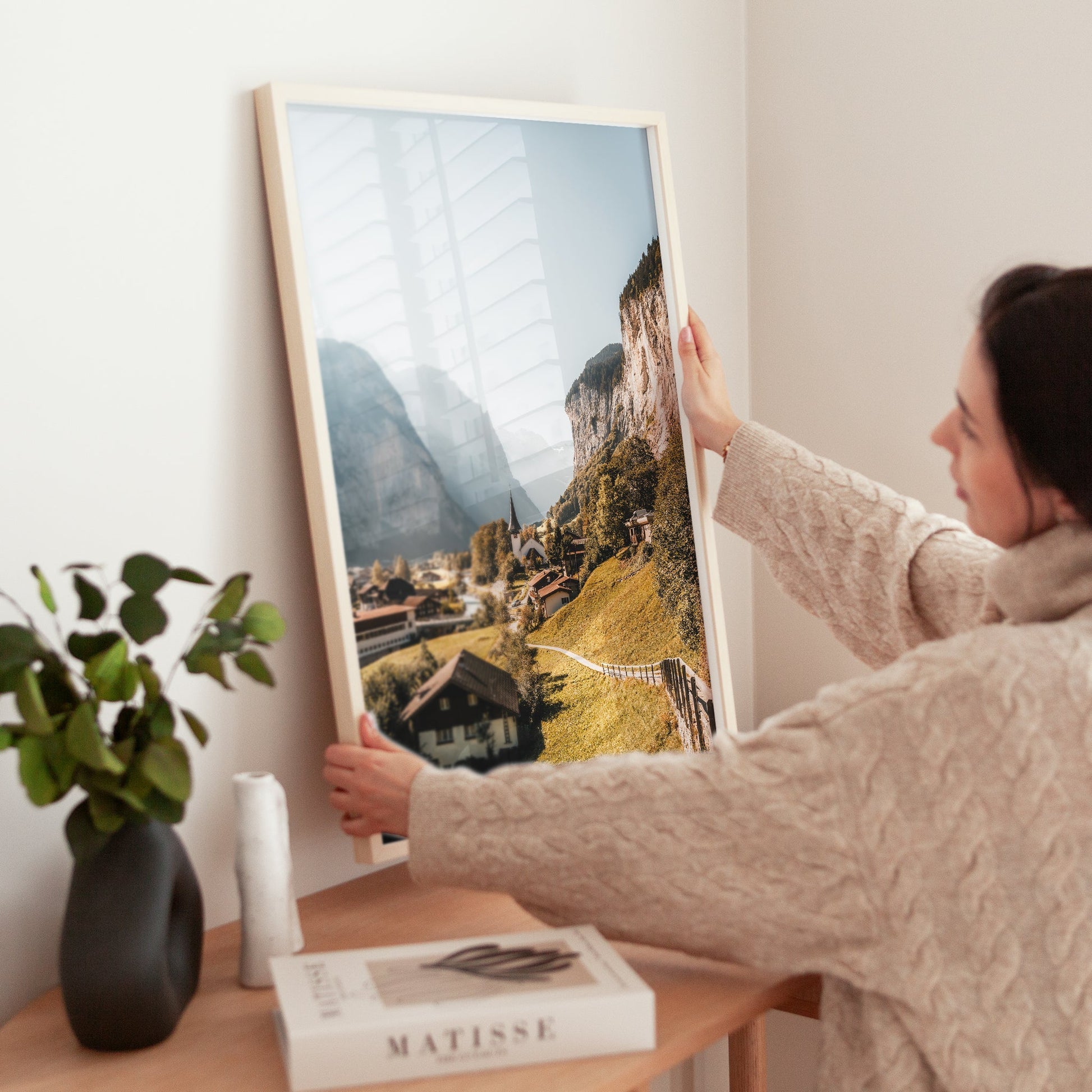Experience the heart of Switzerland with this stunning Lauterbrunnen Valley print. Towering cliffs, cascading waterfalls, and charming chalets make this a must-have for Swiss Alps lovers. Whether you're an adventurer, a dreamer, or someone who just loves a scenic view, this print brings the mountains to you.