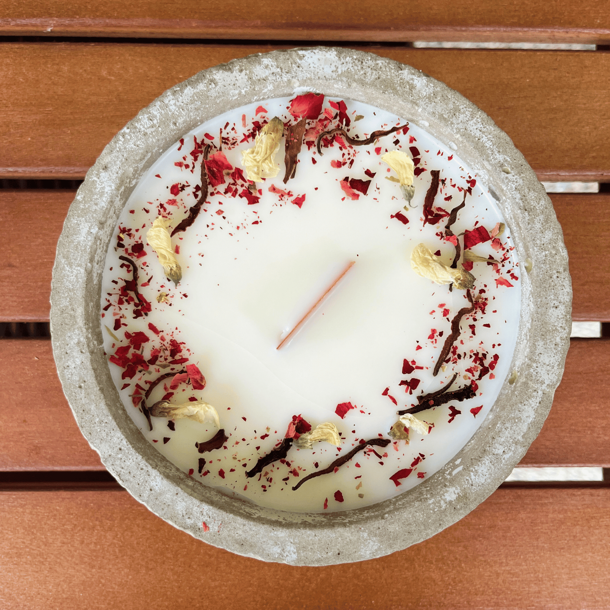 Material: Veganes Sojawachs, versiegelter Beton, Holzdocht, getrocknete Blüten.