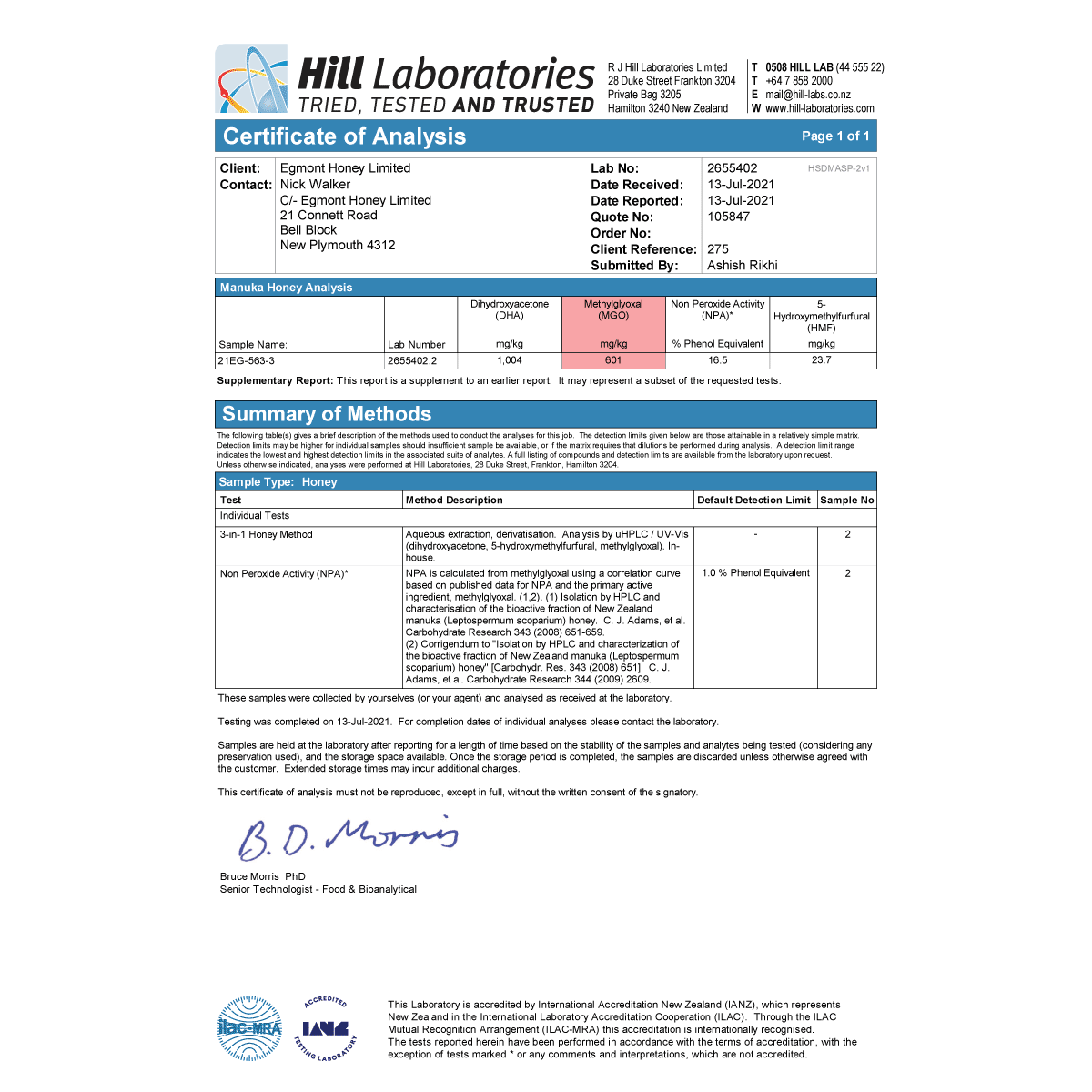 Das Familienunternehmen Egmont Honey hat tausende Bienenstöcke in der Region Taranaki auf der Nordinsel Neuseelands. Dadurch werden die eigenen hohen Qualitätsstandards von der Standortauswahl der Bienenstöcke, Ernte und Abfüllung bei jedem einzelnen Glas überprüft und gesichert.