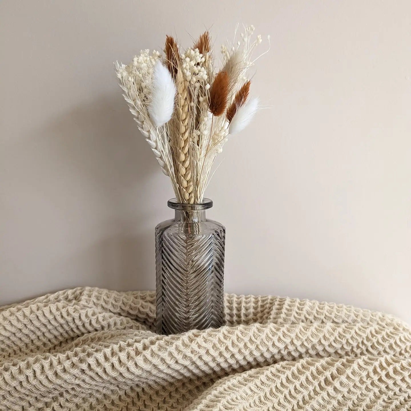 Weiche Lagurus-Gräser verleihen dem Strauß eine flauschige Leichtigkeit, während Ruscus klare, dekorative Akzente setzt. Der sanfte Farbverlauf von Weiß über Creme bis Kupfer sorgt für Tiefe und Wärme – eine stilvolle Ergänzung für Esstisch, Konsole oder Sideboard.