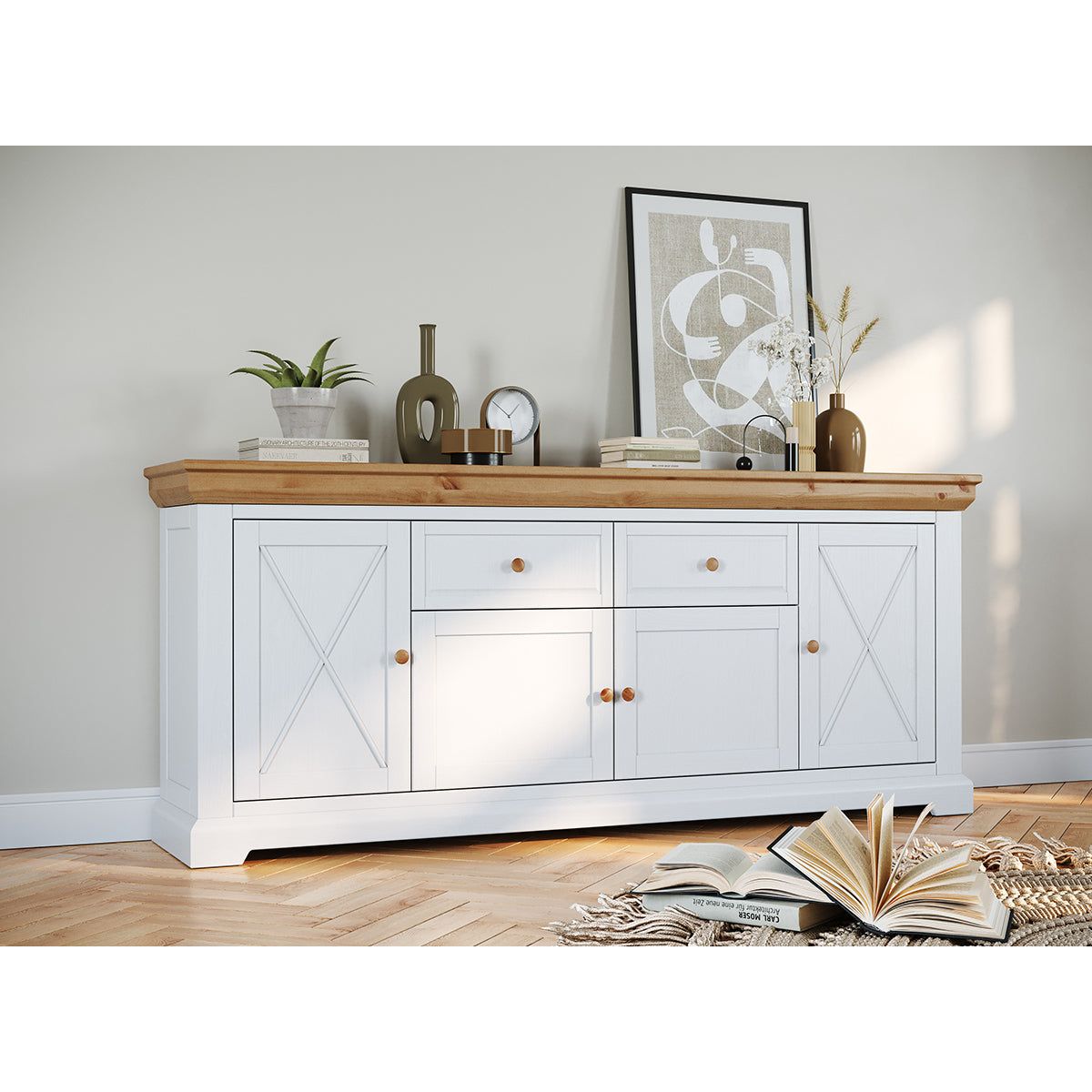 Wenn Sie geräumige Innenräume mögen und sich damit rühmen können, werden Sie auf jeden Fall auf Möbel im XL-Format achten. Eine davon ist die Kommode 2.4 Milano Elite – geräumig, funktional und effektiv. Sie können es im Wohnzimmer, Schlafzimmer, Flur und Esszimmer platzieren – wo immer Sie es brauchen. Ein geräumiger Präsentationstisch sowie geräumige Schränke und Schubladen erleichtern die Anordnung der Gegenstände. Die goldgelbe Kiefernplatte wird mit einem weißen Korpus und einer weißen Front kombiniert. Das Ganze spiegelt perfekt den provenzalischen Stil wider.