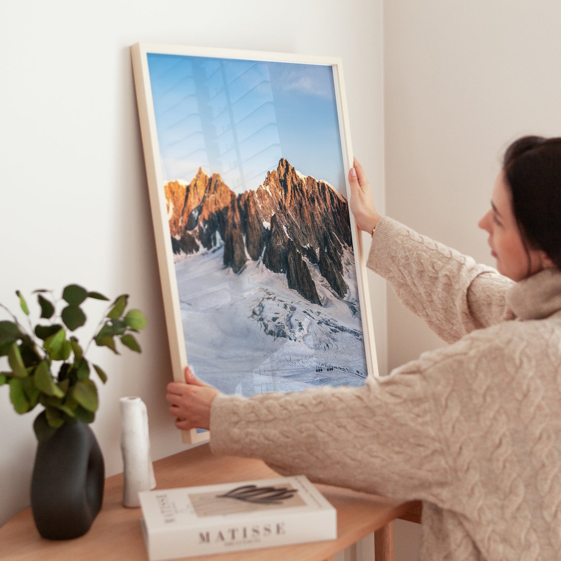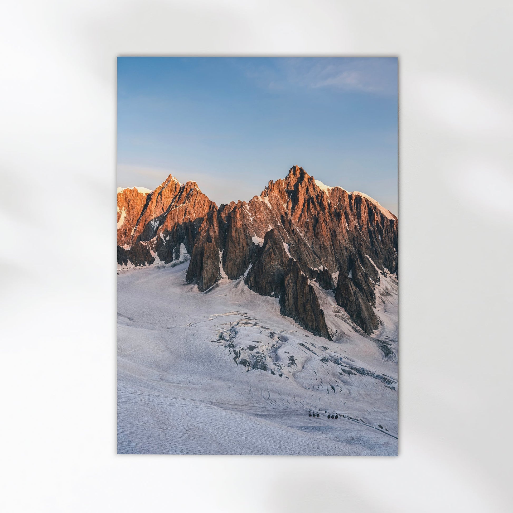 Bring the beauty of the French Alps to your space with this Mont Blanc du Tacul wall art print. Captured during golden hour, this stunning piece showcases the dramatic peaks and glaciers of Chamonix in warm evening light. Perfect for adding a touch of mountain elegance to your home or office.