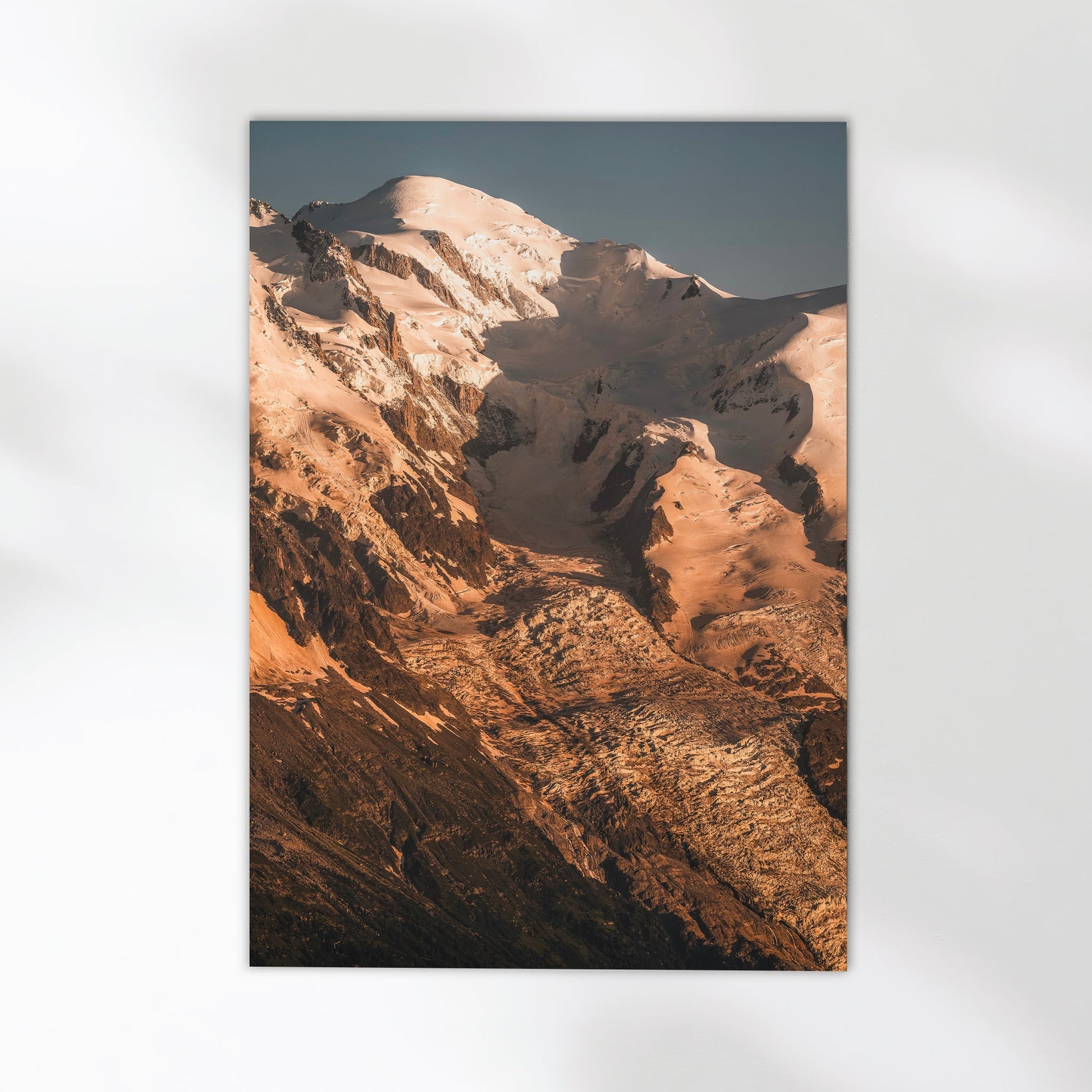 Transform your space with this stunning Mont Blanc wall art print, captured during the golden hour in Chamonix, France. This fine art photograph showcases the breathtaking alpine scenery with warm light cascading over the iconic peaks. Perfect for mountain lovers and Chamonix enthusiasts, this premium quality print makes an ideal addition to any home or office. A
