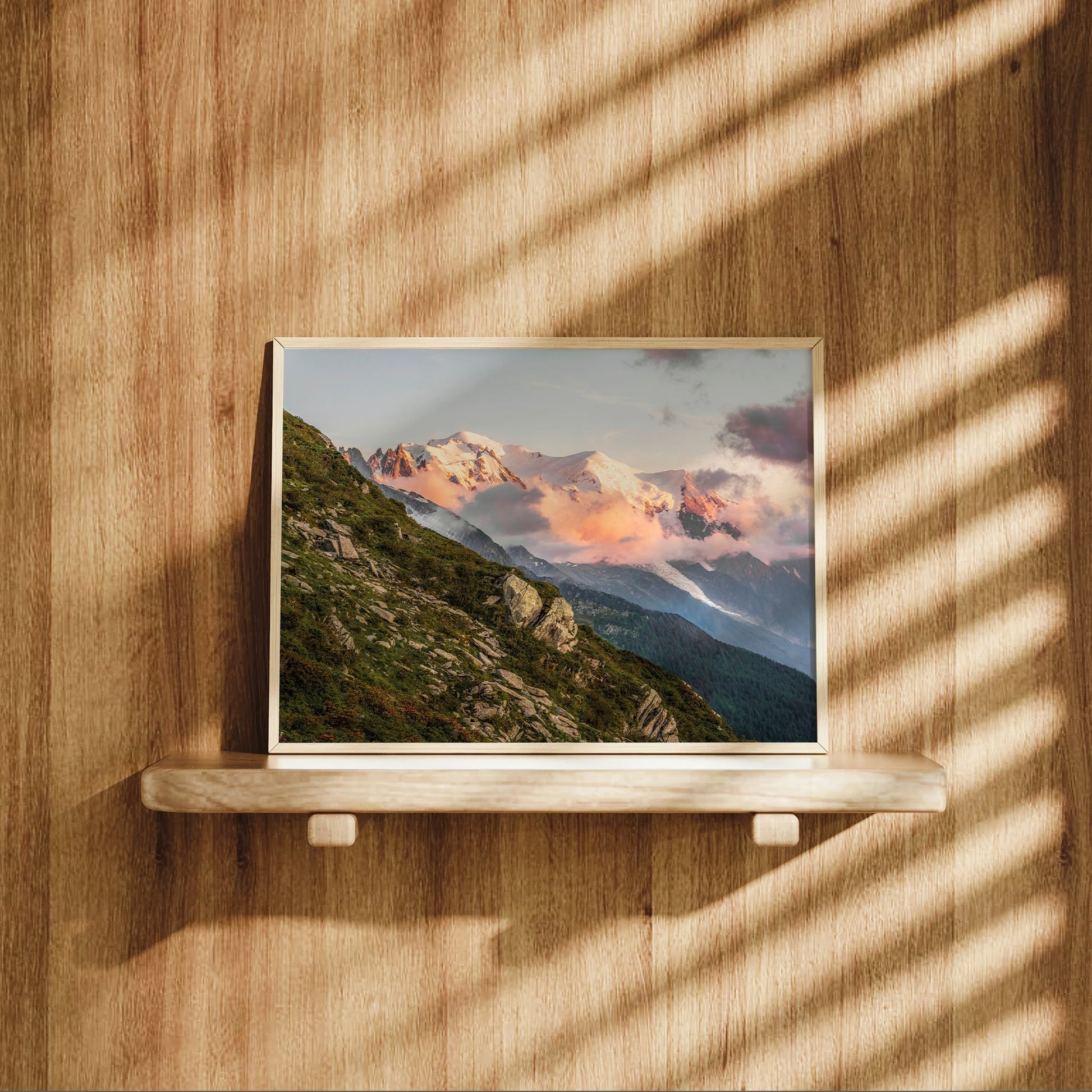 Bring the beauty of the Mont Blanc massif at sunset into your home with this stunning wall art print. The warm, glowing tones of the mountains against the evening sky create a peaceful and timeless scene.