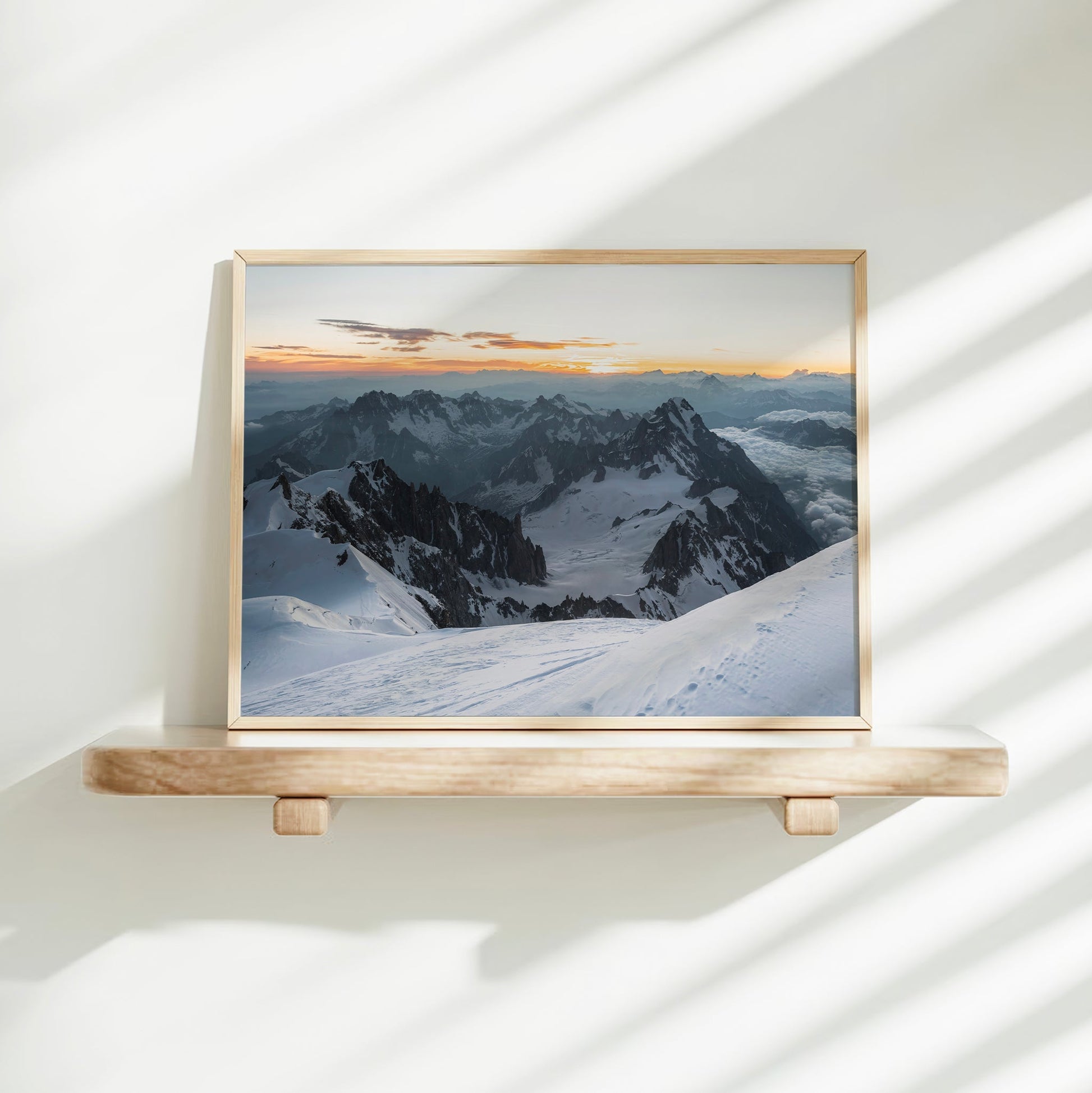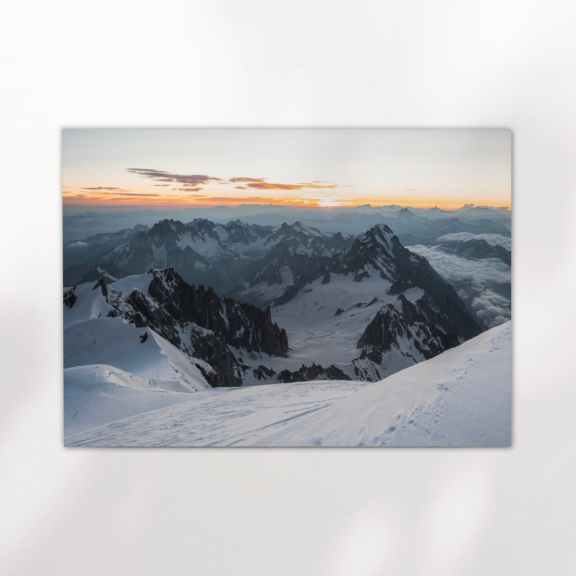 Capture the breathtaking beauty of the Mont Blanc summit with this premium wall art print. Featuring a stunning alpine sunrise and dramatic snow-covered peaks, this artwork is perfect for adding an adventurous and serene touch to your space. Ideal for nature lovers and mountain enthusiasts. Available in various sizes.