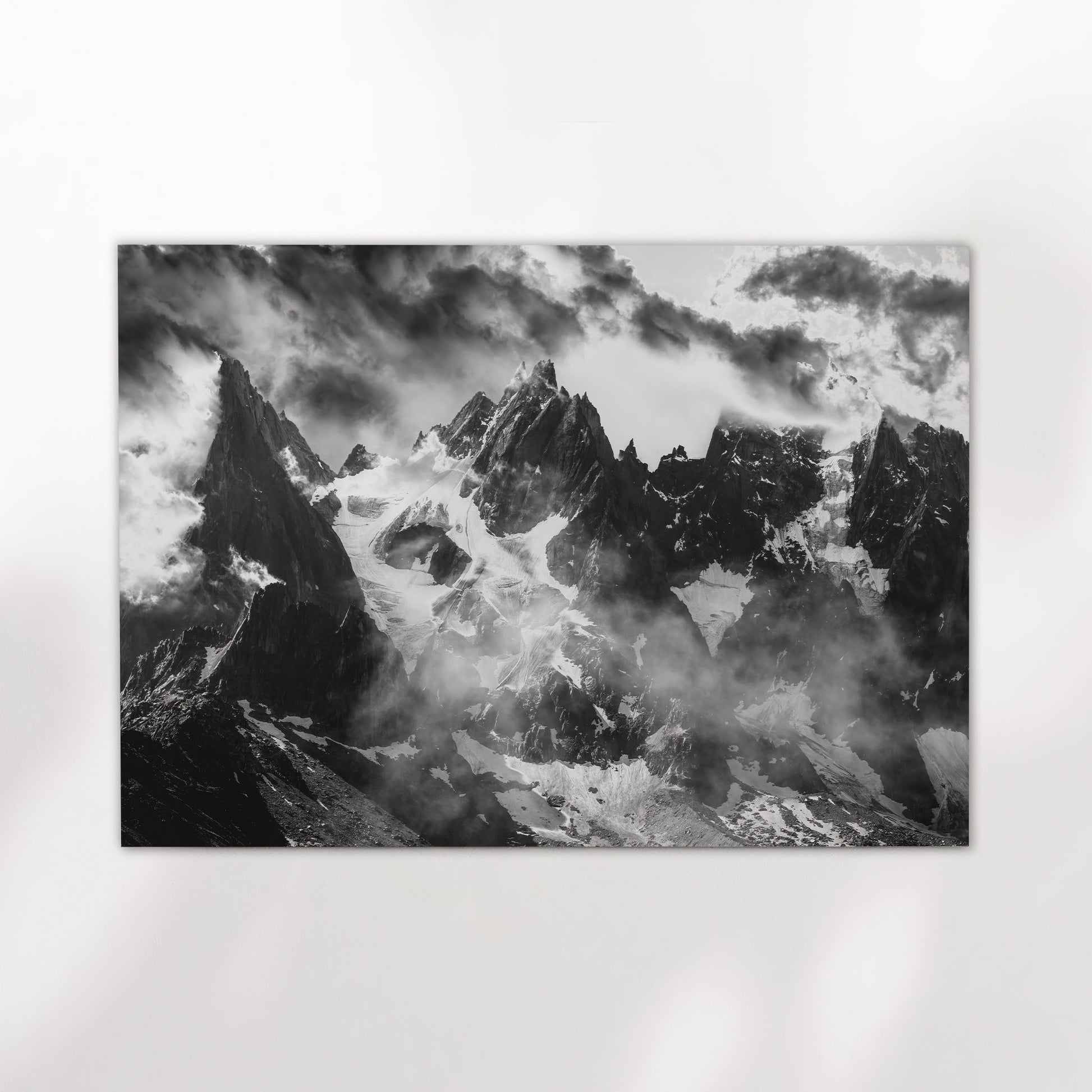 Capture the rugged elegance of the French Alps with this stunning black and white photography print of the Needles of Chamonix. Perfect for modern and rustic interiors, this dramatic art piece showcases jagged alpine peaks veiled in mist.