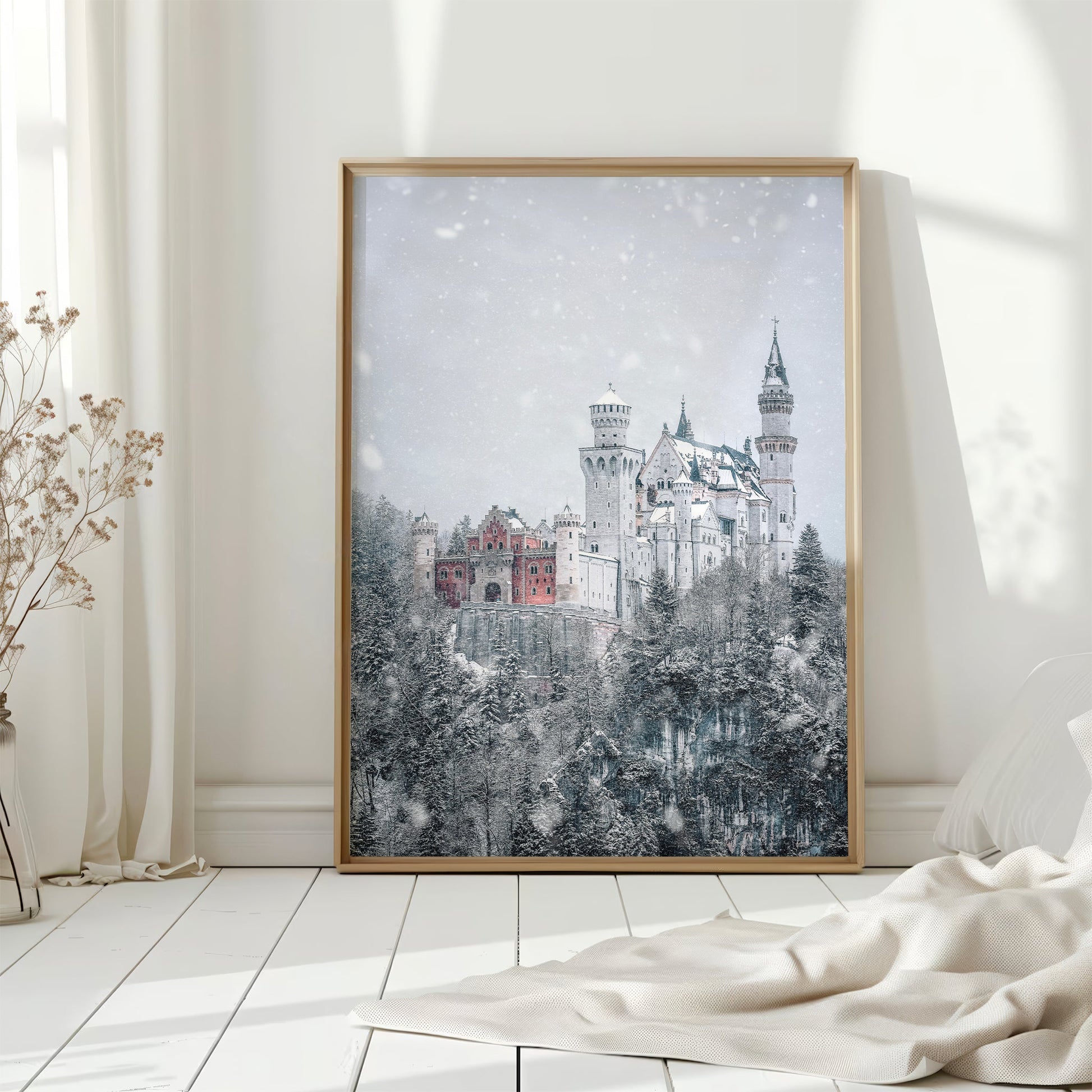 A dreamy winter view of Neuschwanstein Castle in Bavaria, Germany. Captured during snowfall, this fine art print brings fairytale charm to your space with its snowy peaks, red castle walls, and magical forest setting.