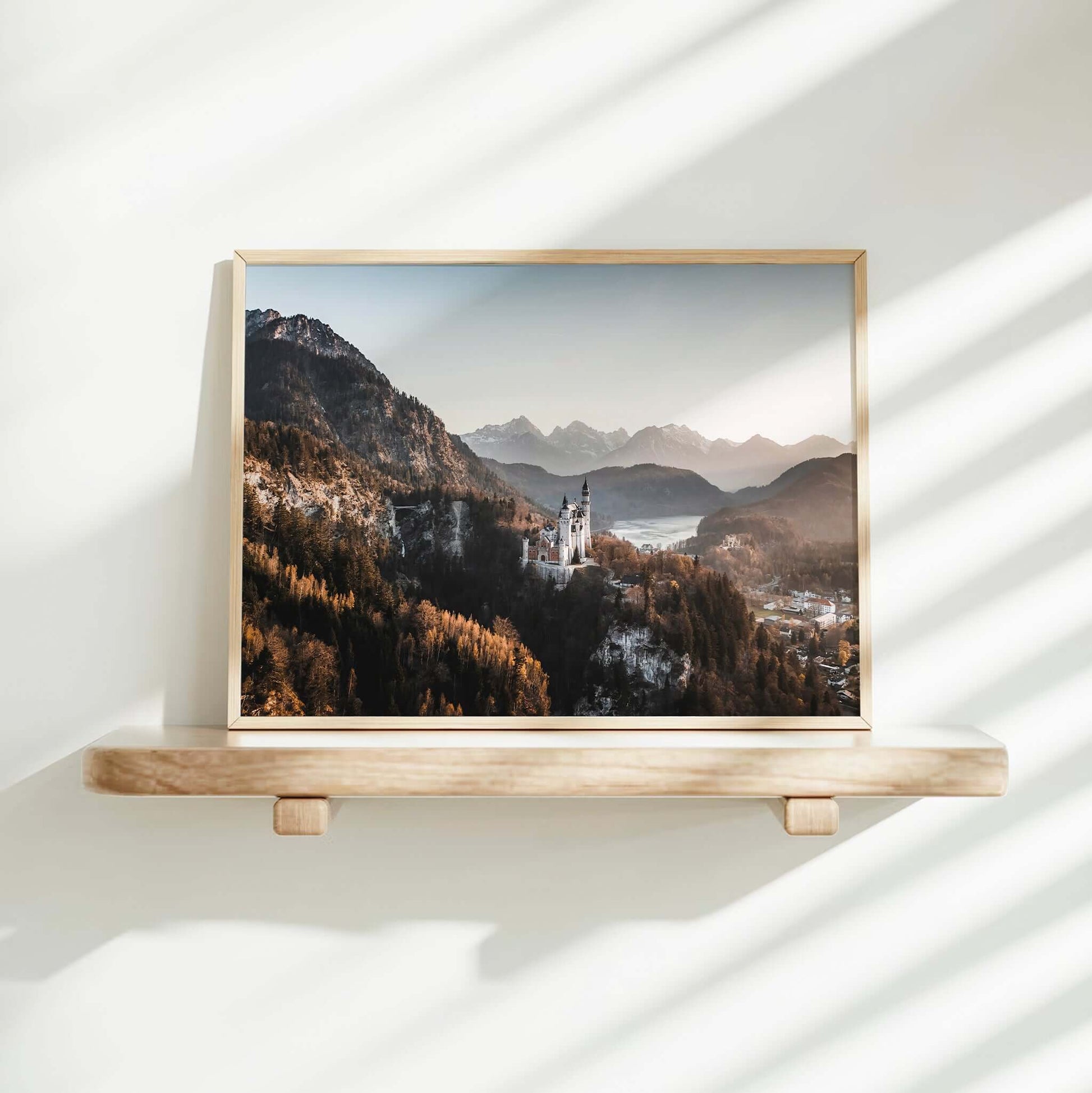 A dreamy view of Neuschwanstein Castle at golden hour, surrounded by the peaks and forests of Bavaria’s Alps. This fine art photograph captures the castle’s fairy-tale beauty with soft evening light and mountain stillness. Perfect for adding warmth and a sense of wonder to any wall, it brings a touch of European charm to your home or workspace.