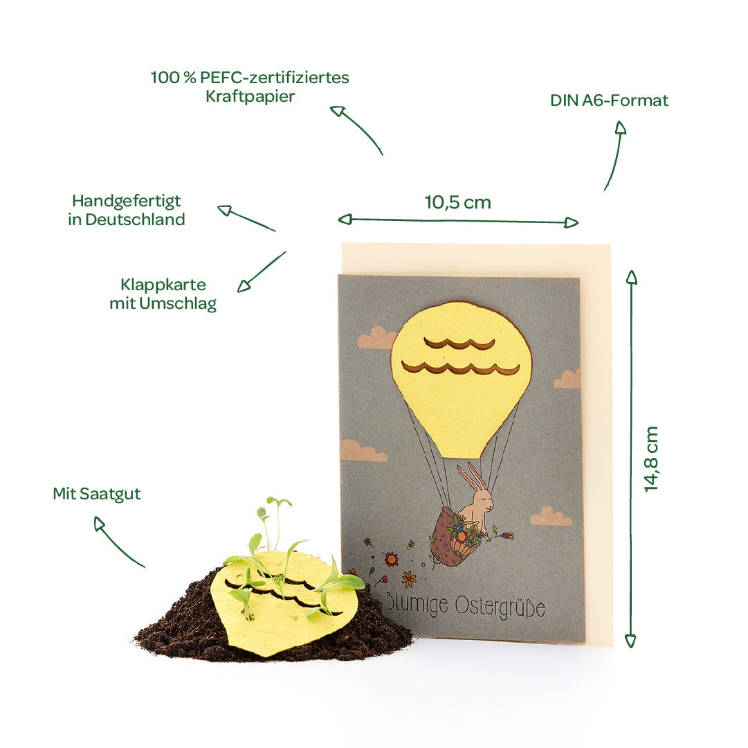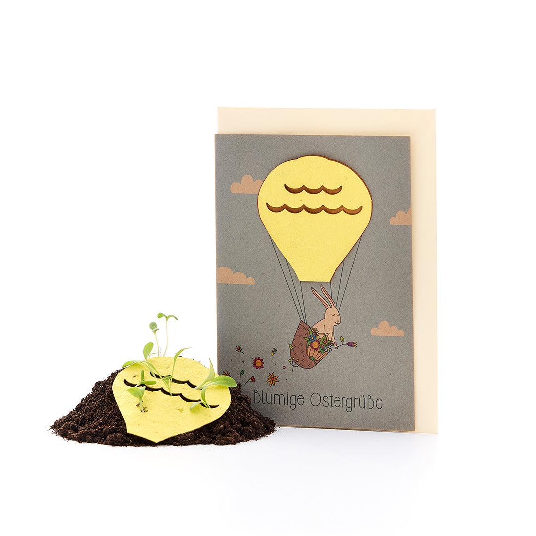 WACHSENDE OSTERGRÜßE: Verschenke eine ganz besondere Osterkarte. Das liebevoll gestaltete Heißluftballon-Motiv besteht aus handgeschöpftem Saatpapier mit Samen für eine bunte Wildblumenwiese. Nach dem Einpflanzen wachsen aus der Grußkarte wunderschöne Blumen.