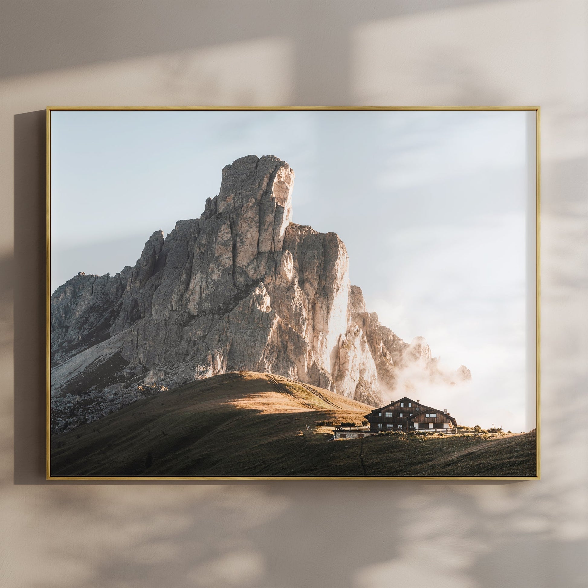 A fine art photography print of Passo Giau, one of the most striking mountain passes in the Dolomites. Shot during golden hour, this print brings the textures of the Italian Alps into your space with soft light and natural tones.