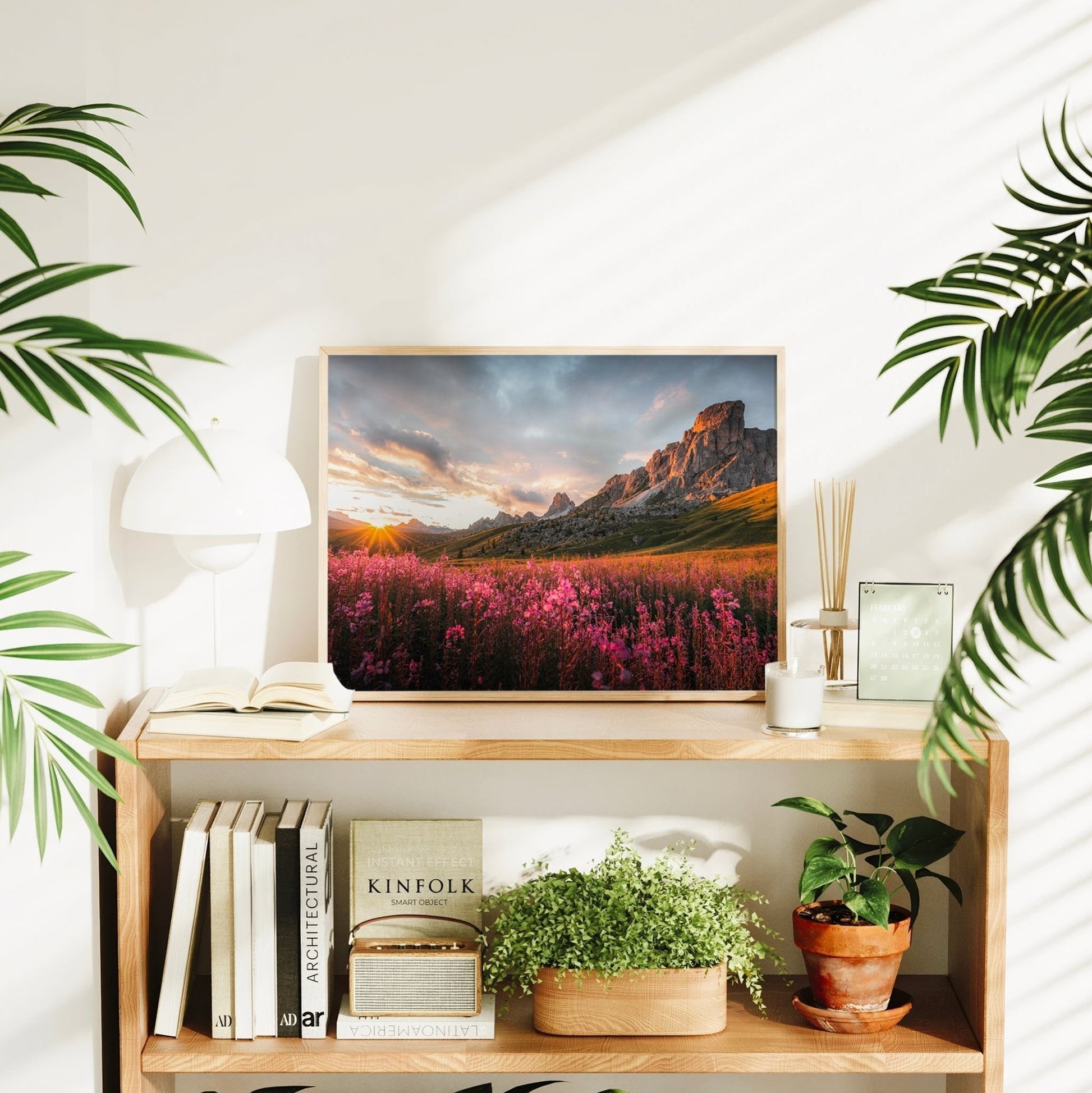 Transform your space with this beautiful Passo Giau wall art print, featuring the dramatic peaks of the Dolomites at golden hour. Captured in the heart of the Italian Alps, this fine art landscape photography print showcases wildflower fields glowing in the evening sun beneath towering alpine rock formations.