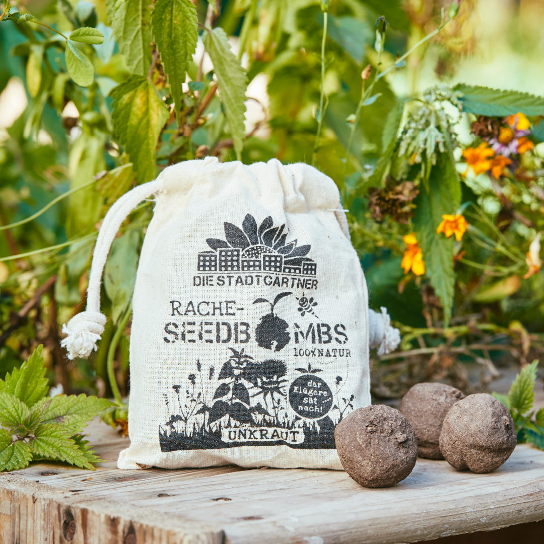 Jede Rachebomb enthält eine Mischung verschiedener Unkräuter, u.a. Brennnessel, Löwenzahn, kriechender Hahnenfuß, Vogelmiere, Rotklee und Disteln. Der Jutebeutel enthält 8 walnussgroße Samenbomben bestehend aus Erde, Ton und Saatgut.
