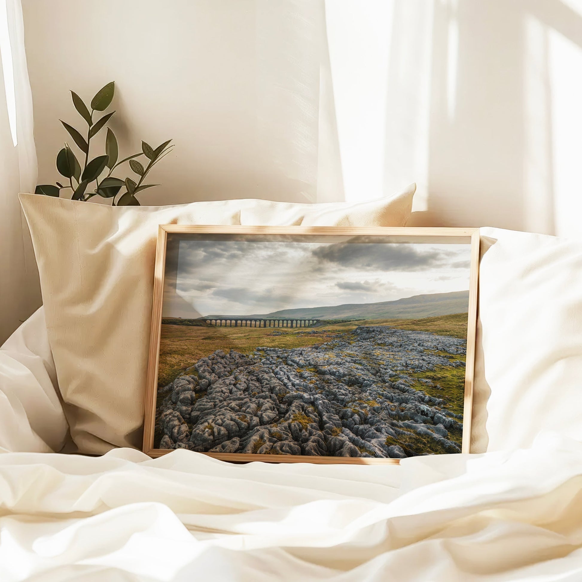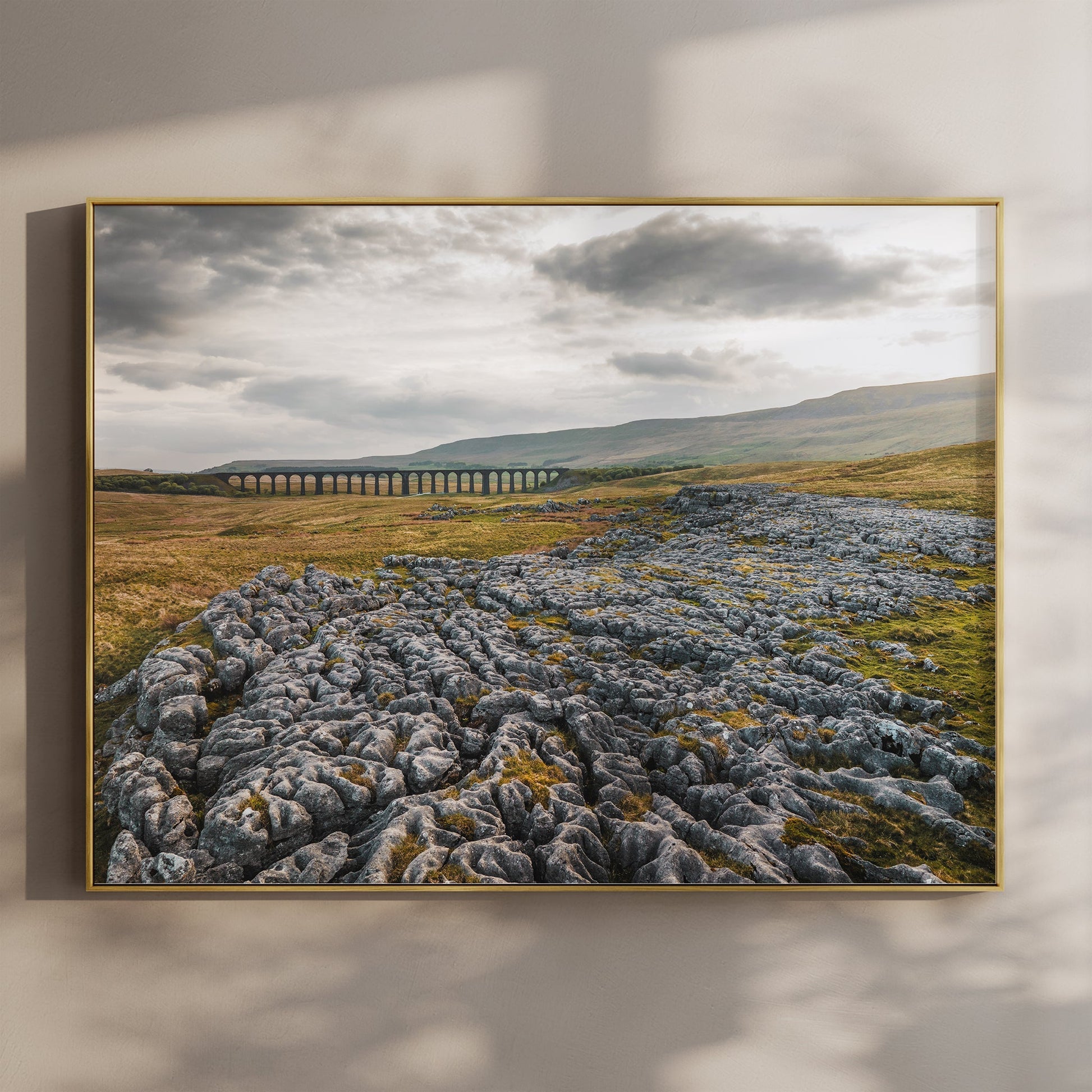 A striking fine art print of Ribblehead Viaduct cutting through the remote hills of the Yorkshire Dales. Limestone pavement leads the eye into this dramatic and rugged English landscape, captured in soft light with layers of shadow and cloud overhead. A timeless piece of northern countryside wall art for nature lovers, hikers, and fans of the Dales.