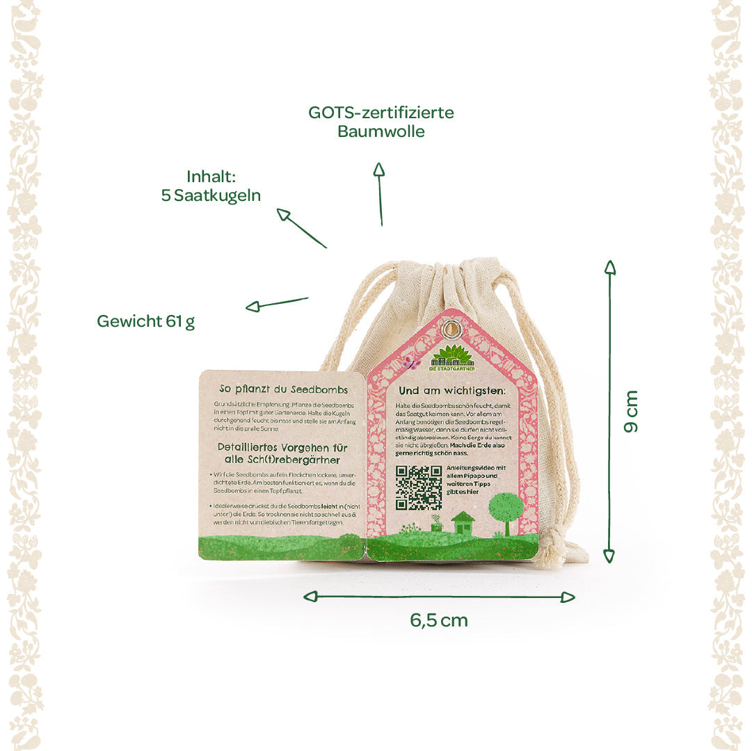 Nachhaltig & einfach: Das Säckchen besteht aus nachhaltiger GOTS-zertifizierter Baumwolle und ist wiederverwendbar. Die Saatkugeln lassen sich kinderleicht auswerfen – keine Gärtnererfahrung notwendig.