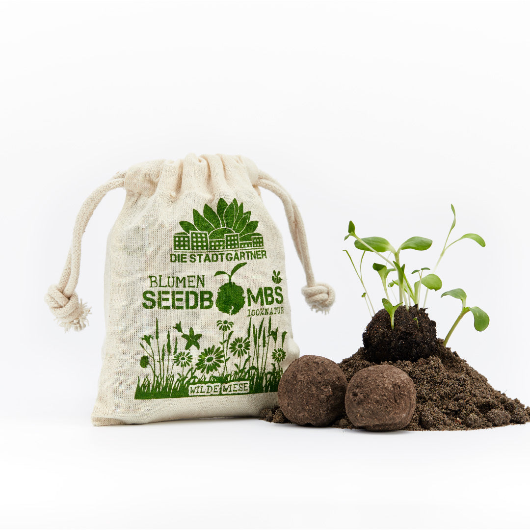 Schon mal eine Blumenwiese zu Besuch mitgebracht? Mischung: 'Wilde Wiese' enthält 54 heimische Wildblumensamen, wie z.b. Bienenfreund, Kornnelke, Ringelblume, Rittersporn und Blaues Sperrkraut. Die Seedbombs müssen nicht eingepflanzt werden, sondern können direkt oder per Wurfsendung an der gewünschten Stelle ausgebracht werden. Der Jutebeutel enthält 8 walnussgroße Samenbomben bestehend aus Erde, Ton und ökologischem Saatgut.