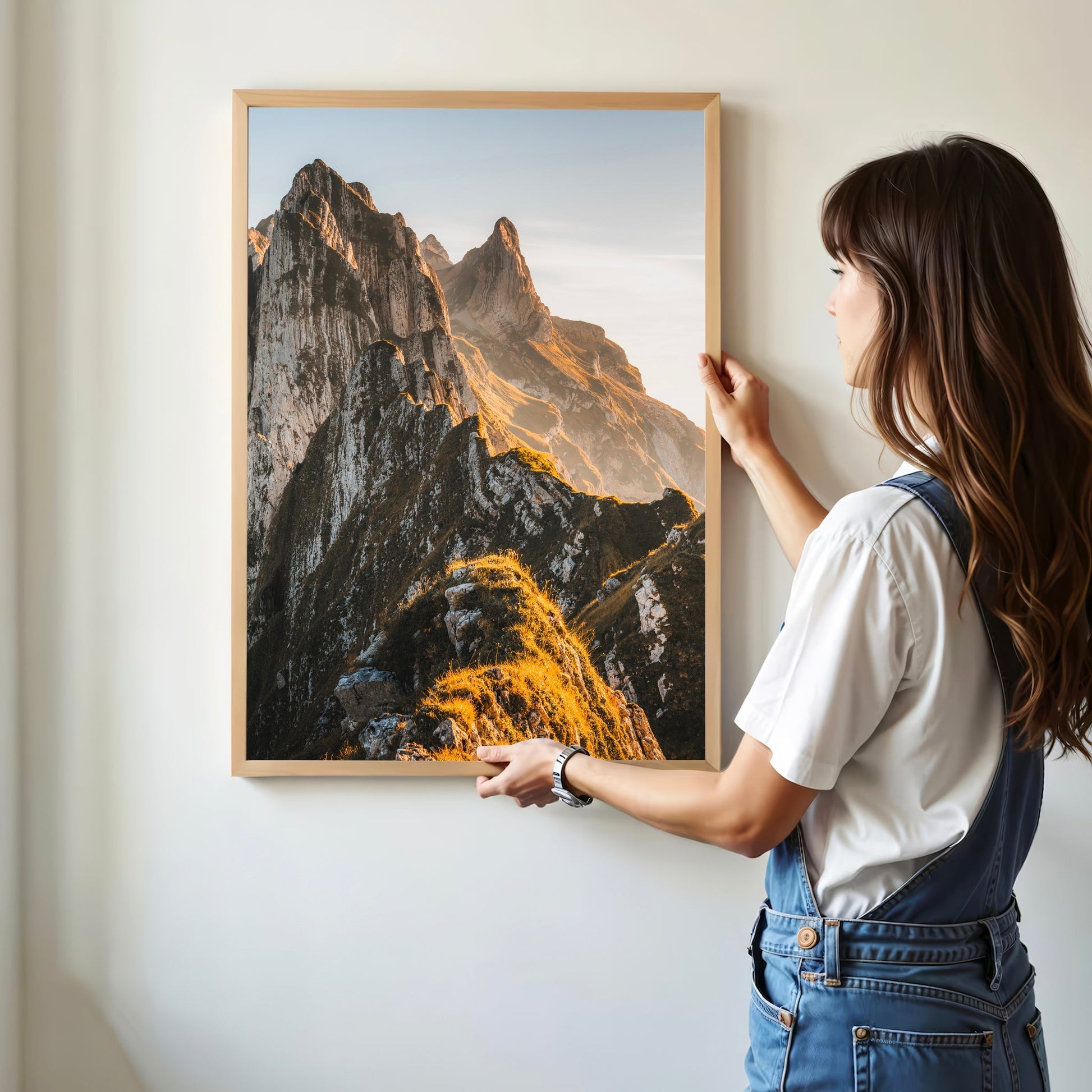 Bring the dramatic ridges of the Swiss Alps into your home with this fine art print of Schäfler in golden hour light. Captured in the Appenzell region, this striking vertical landscape makes a bold statement in any space. Printed on premium matte paper and available in a range of sizes, it’s ideal for mountain lovers, hikers, and collectors of natural scenery.