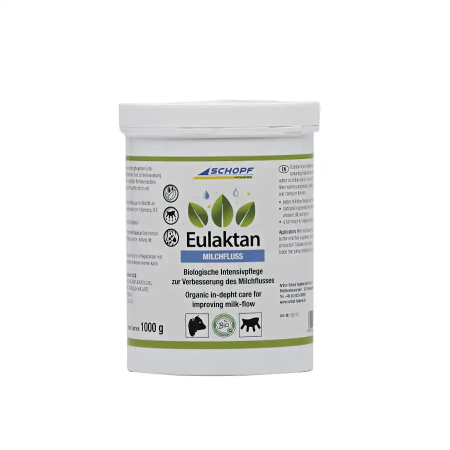 fördert durch intensive Massage den Milchfluss spezielle Inhaltsstoffeinstellung mit Sternanis, Dill und Fenchel bestens geeignet für Bio-Betriebe Eulaktan ist ein intensiv pflegender Euterbalsam mit ätherischen Ölen zur Verbesserung der Qualität der Euter und für Bio-Betriebe bestens geeignet. Eulaktan ist sehr hautfreundlich.