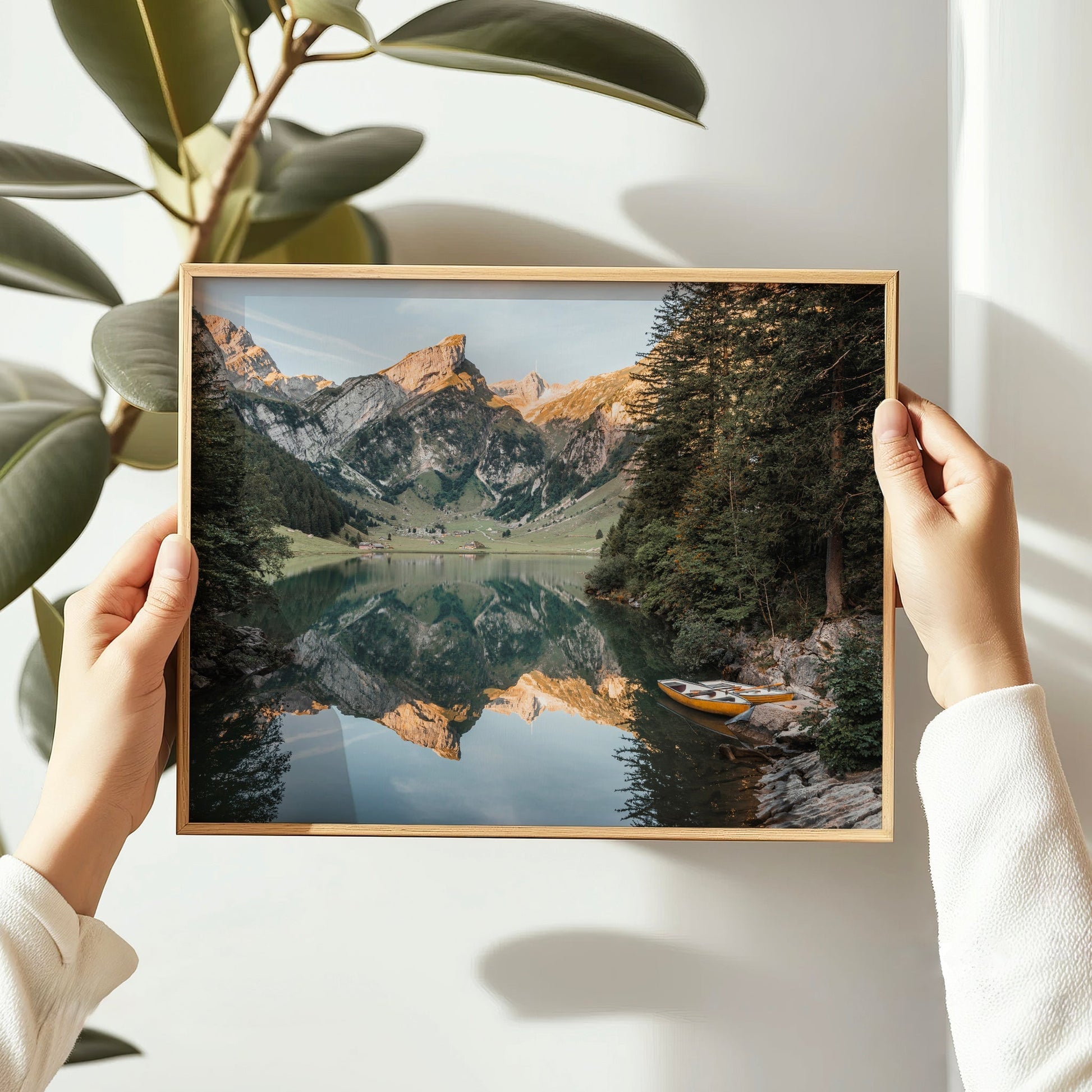 A tranquil Alpine lake reflecting golden peaks—timeless Swiss beauty for your walls.