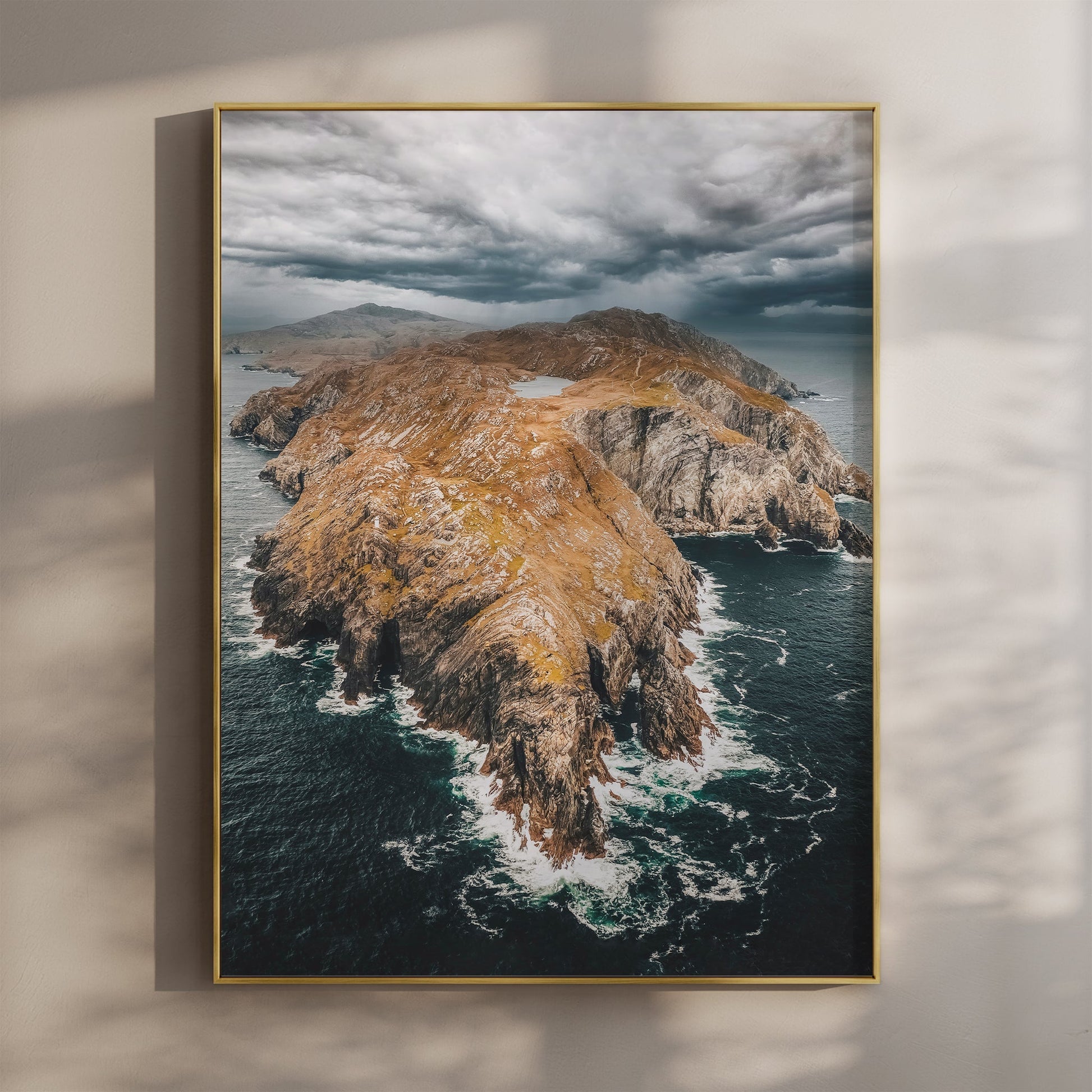 A dramatic fine art print of Sheep’s Head Peninsula in West Cork, Ireland. Captured from above, this rugged headland juts into the Atlantic under textured skies, offering a striking composition of golden cliffs and deep blue ocean. Ideal for anyone who loves wild coastal landscapes and moody tones.