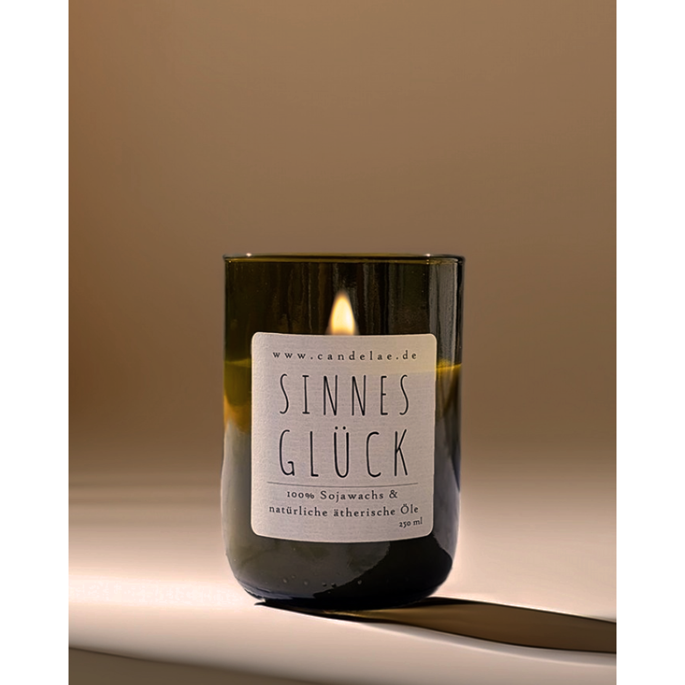 Entdecken Sie Sinnesglück – eine natürliche Duftkerze im Weinflaschenglas, handgegossen in Eich (Rheinhessen). Aus 100 % Sojawachs (vegan, pflanzenbasiert) mit ätherischen Ölen geschaffen, sorgt diese Kerze für eine ruhige, warme Atmosphäre und lädt zum bewussten Ankommen im Moment ein.