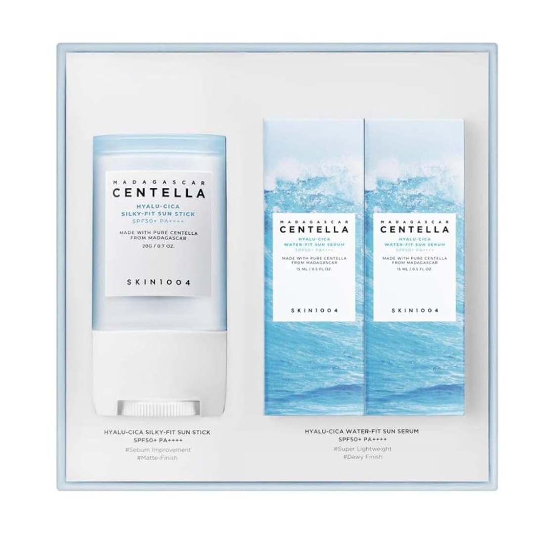 Das SKIN1004 Madagascar Centella Hyalu-Cica Sunsational Kit vereint hochwirksamen Sonnenschutz mit pflegender koreanischer Kosmetik. Ideal für alle Hauttypen, kombiniert dieses Set zwei leistungsstarke Produkte: das Hyalu-Cica Water-Fit Sun Serum und den Hyalu-Cica Silky-Fit Sun Stick. Beide schützen zuverlässig vor UVA- und UVB-Strahlen, spenden Feuchtigkeit und stärken die Hautbarriere – ganz ohne Weißfilm.
