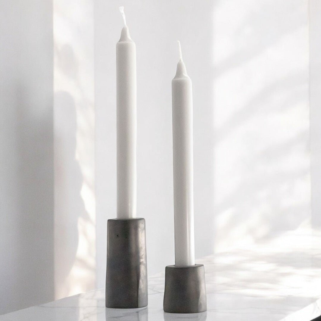Verwandle Deine Tischdeko – mit dem 2er Set Stabkerzenhalter STELLA von Manubeton. Diese minimalistischen Kerzenhalter sind dezent und trotzdem echte Hingucker. Gefertigt aus hochfestem, feinporigem Beton in den Farbtönen Grau und Anthrazit, strahlen sie eine natürliche, robuste Eleganz aus. Jedes Stück ist handgemacht und somit ein echtes Unikat, das die persönliche Note in Deinem Zuhause unterstreicht. Setze Deine Stabkerzen mit diesen zeitlosen Kerzenhaltern in Szene. Sie sind für alle Standard Stabkerzen geeignet.