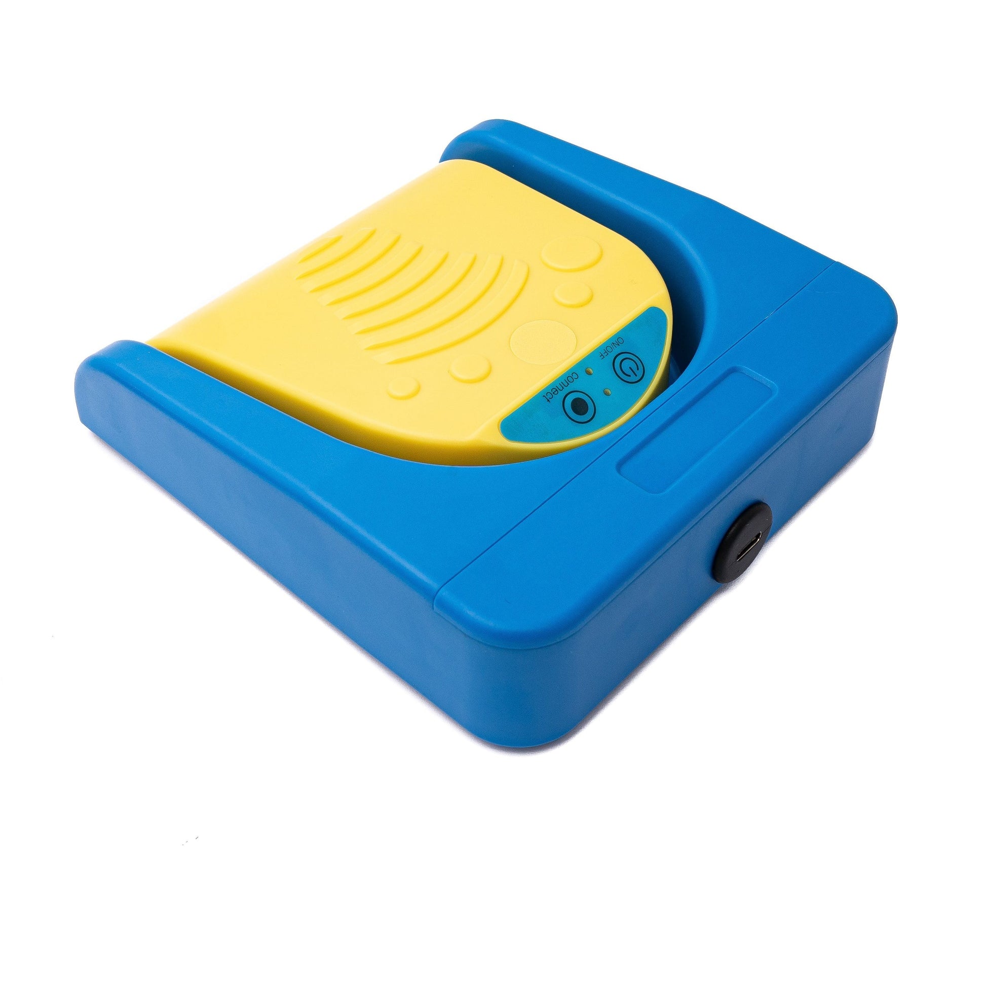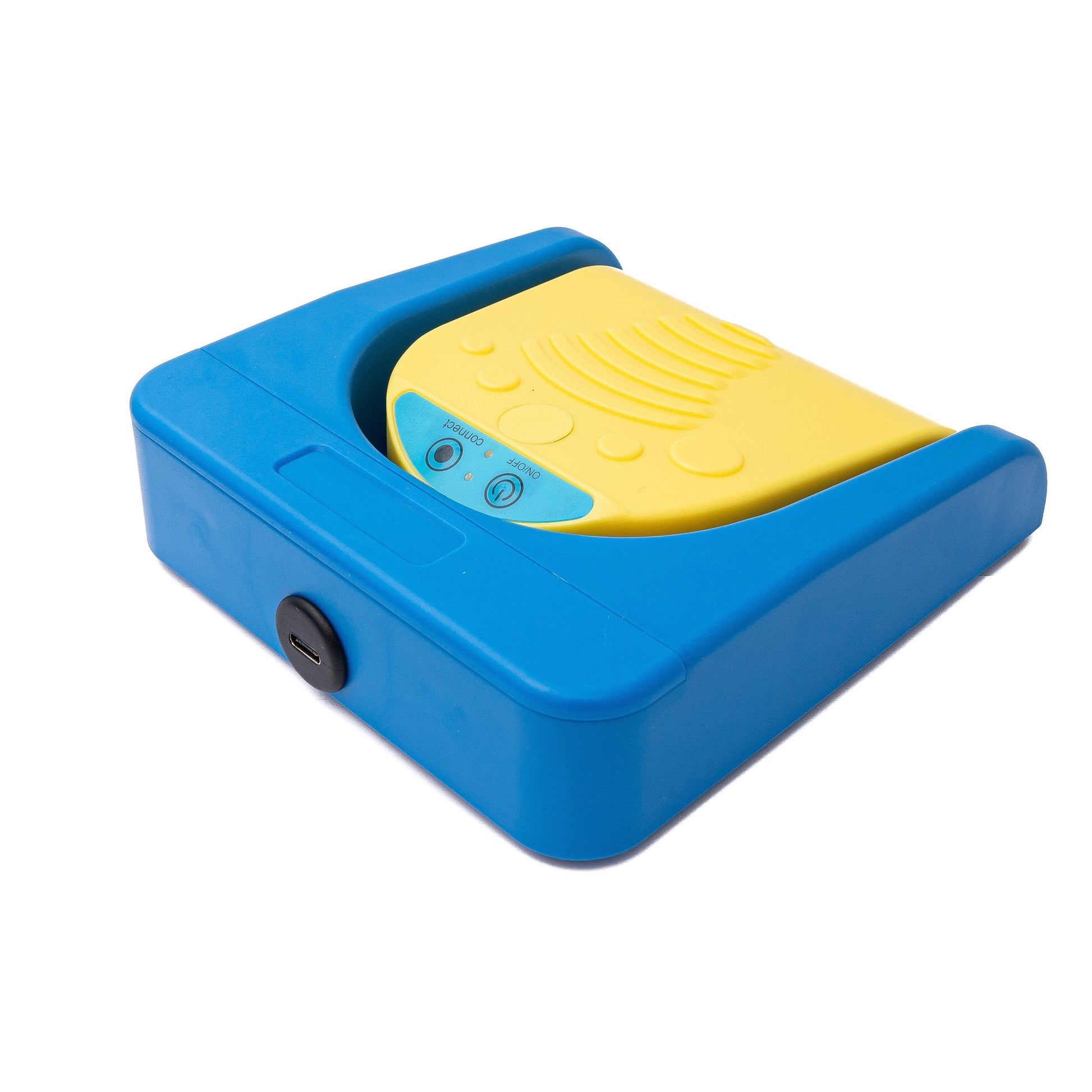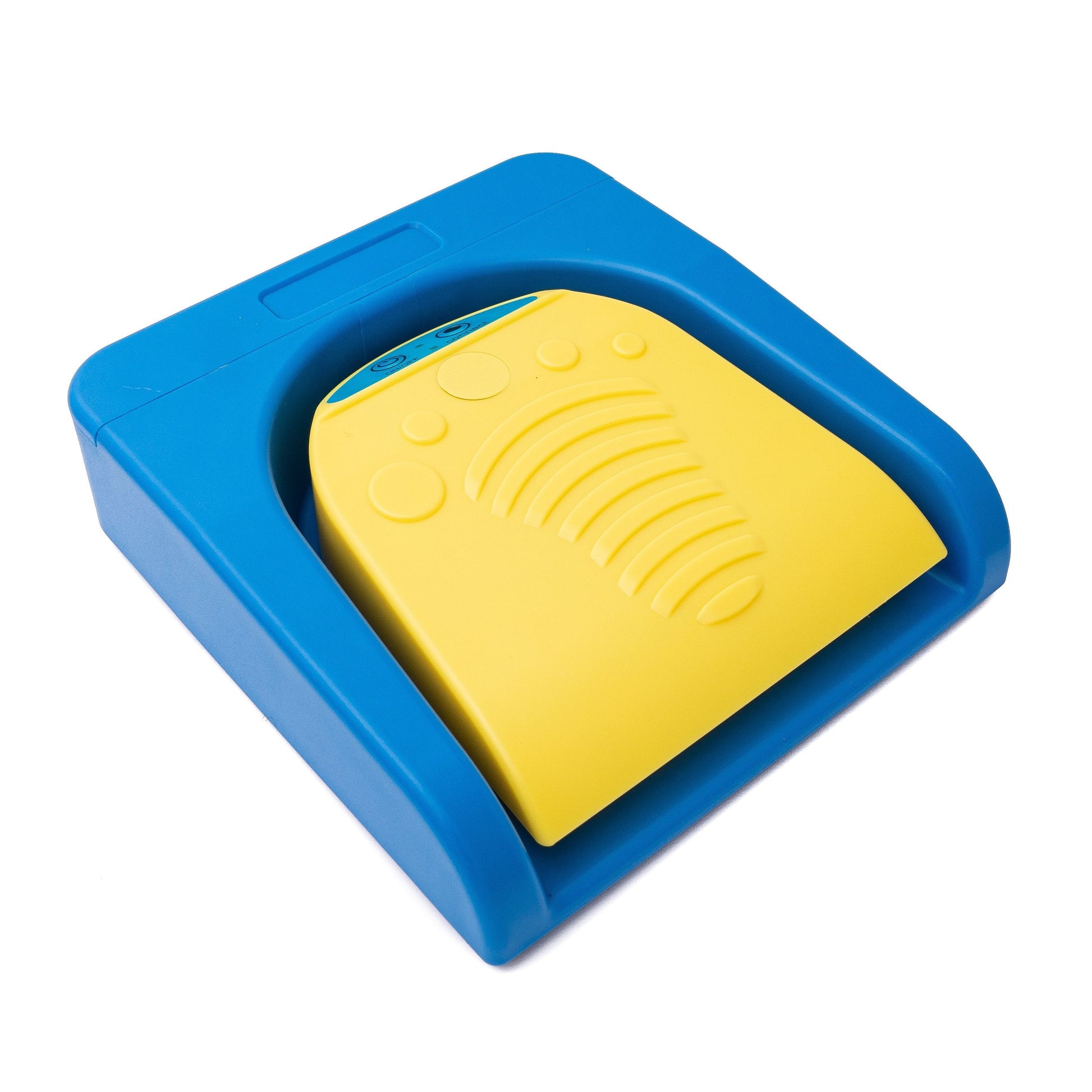Warnfarbe Design: Das Fußpedal ist in auffälligem Blau-Gelb gestaltet, um die Sichtbarkeit zu erhöhen.