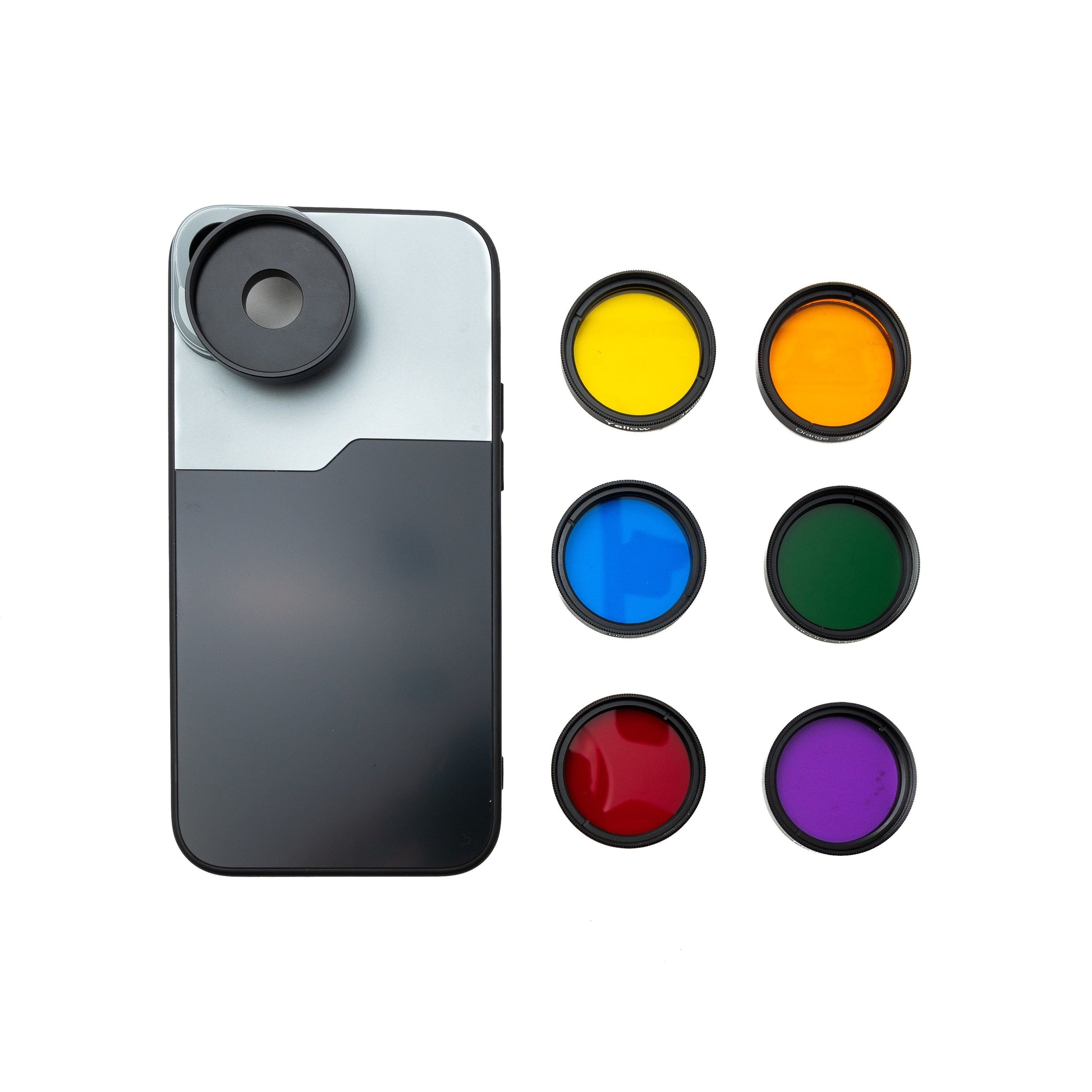 Lieferumfang: Hartschale mit Gewinde, Aufsatz und Linsen (Blau, Rot, Orange, Gelb, Grün, Lila) - ausschließlich geeignet für iPhone 15 Plus