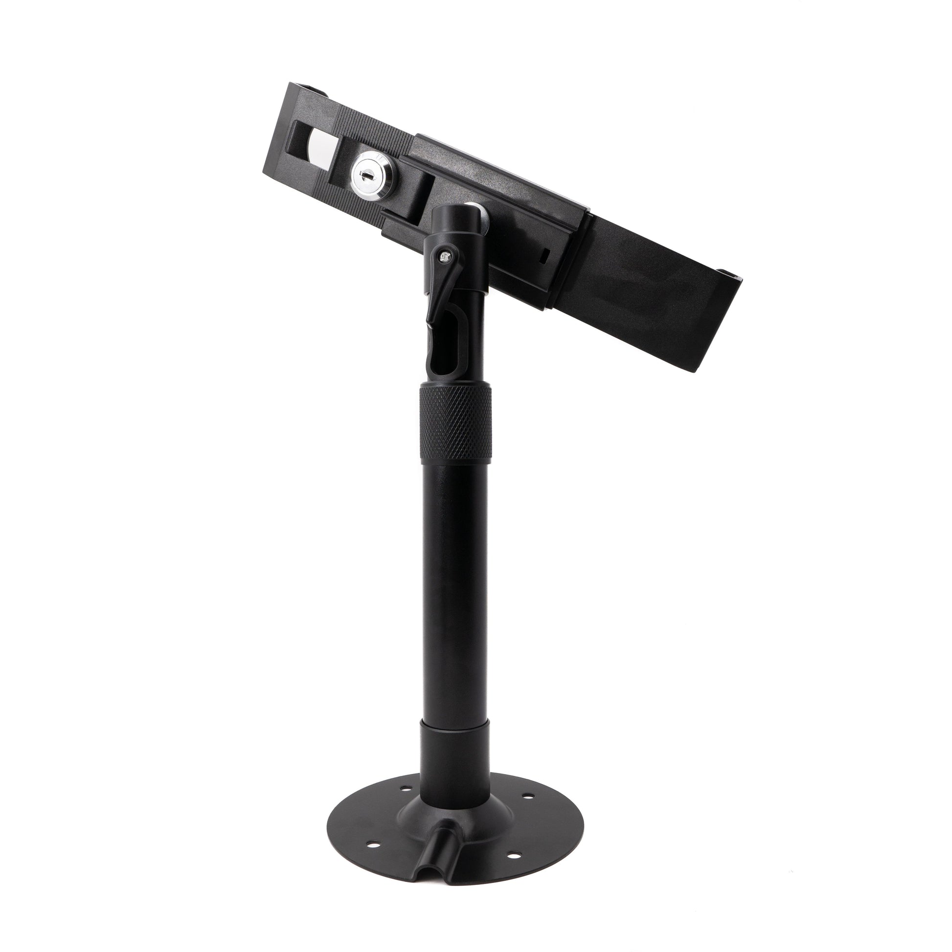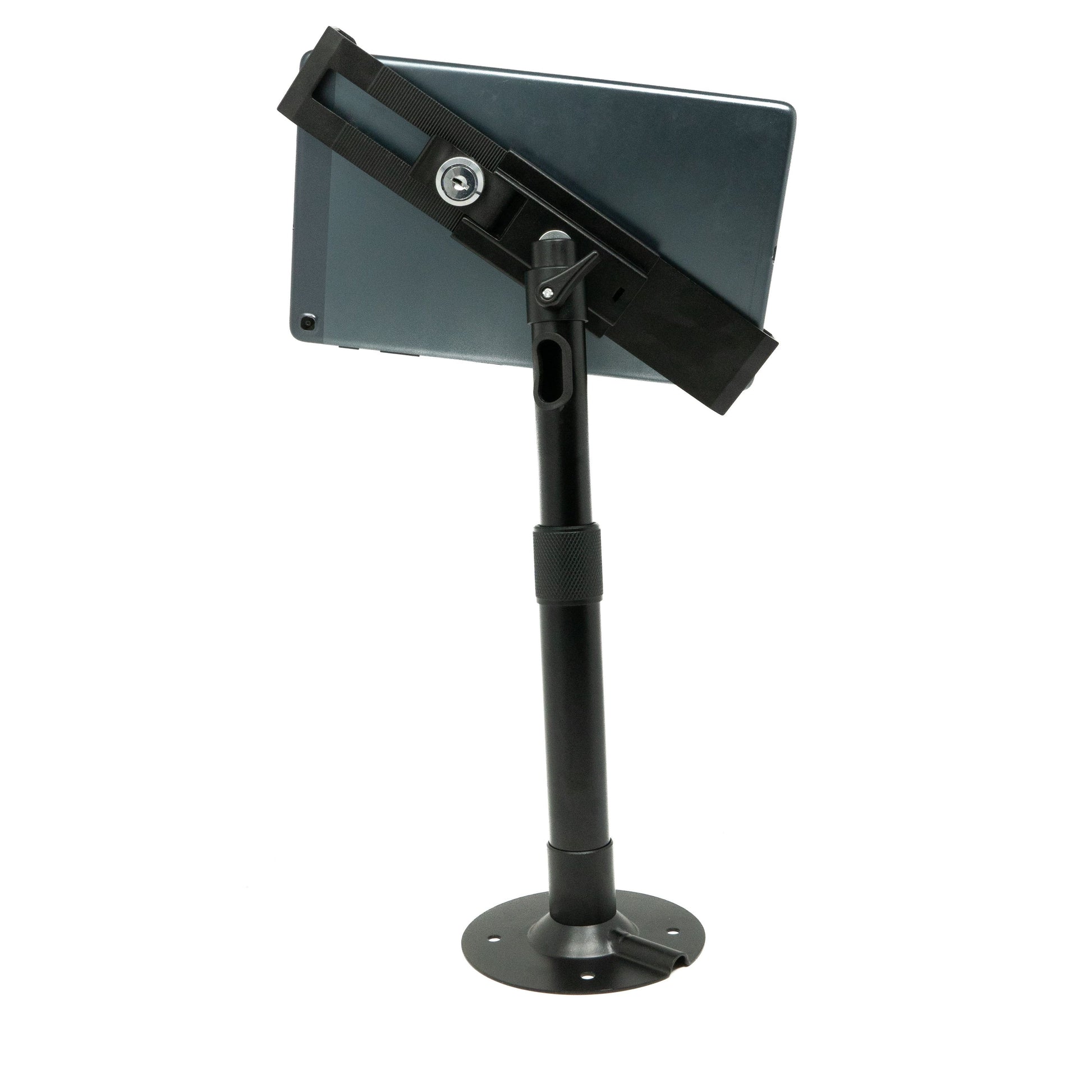 Die abschließbare Halterung von System-S bietet eine sichere und vielseitige Lösung zum Platzieren von Tablets auf Tischen und anderen Oberflächen. Mit einem höhenverstellbaren Halterarm (ca. 37 bis 51 cm), der um 360° bewegbar und um 160° neigbar ist, ermöglicht diese Halterung maximale Flexibilität bei der Positionierung Ihres Tablets. In elegantem Schwarz gehalten, passt sie perfekt zu verschiedenen Einrichtungsstilen. Geeignet für Tablets mit einer Bildschirmdiagonale von 8.0" bis 11.0".