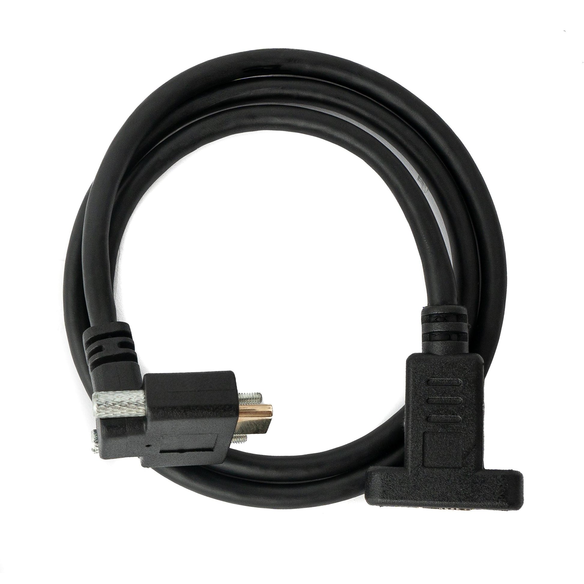 Anschlüsse und Befestigung: Das Kabel ist mit einem gewinkelten (down-angled) Typ C Stecker und einer Typ C Buchse ausgestattet, beide mit der Möglichkeit zur Panel-Mount-Befestigung (17mm).