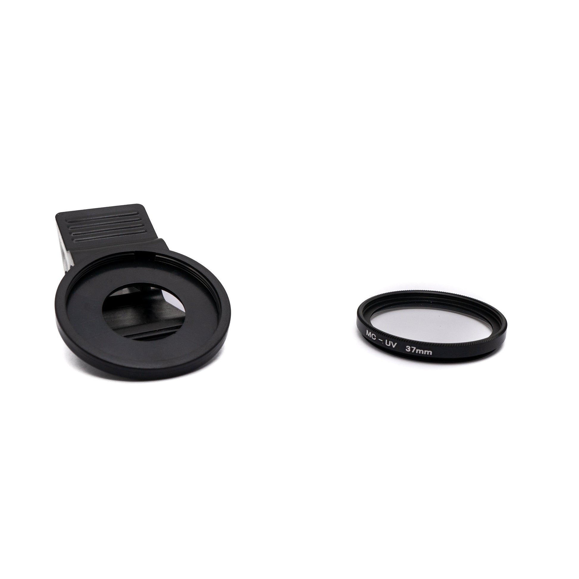Der UV Filter 37 mm 2x beschichtet Slim Linse mit Clip für Smartphones in Schwarz von System-S ist ein guter UV-Filter für Smartphones mit einem 37-mm-Objektivgewinde. Er ist einfach zu verwenden und hilft, die Bildqualität bei Außenaufnahmen zu verbessern.