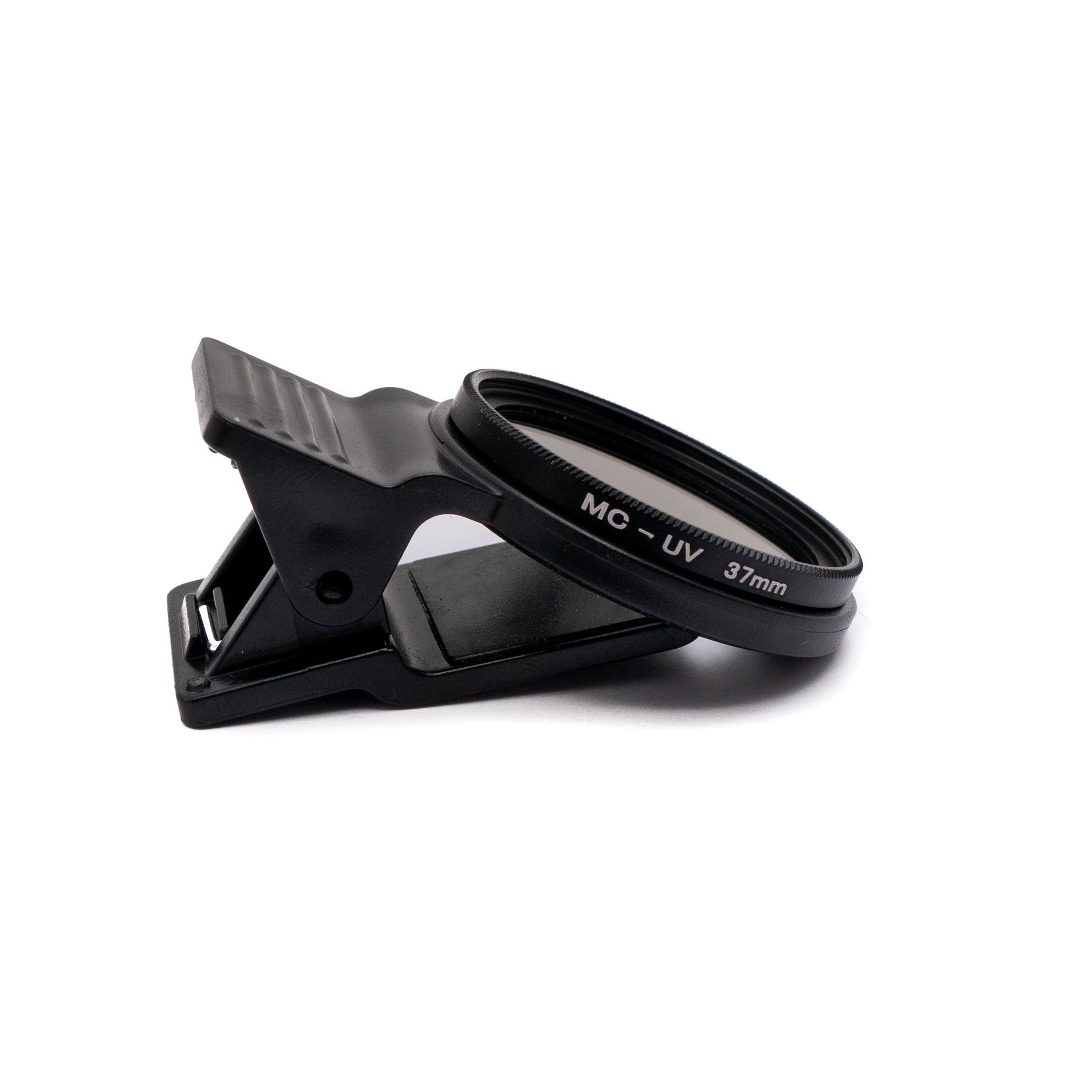Der UV Filter 37 mm 2x beschichtet Slim Linse mit Clip für Smartphones in Schwarz von System-S ist ein UV-Filter für Smartphones mit einem 37-mm-Objektivgewinde. Der Filter besteht aus zweifach beschichtetem Glas, das ultraviolettes Licht absorbiert, das zu Unschärfe, chromatischen Aberrationen und Blaustichen bei Außenaufnahmen führen kann.