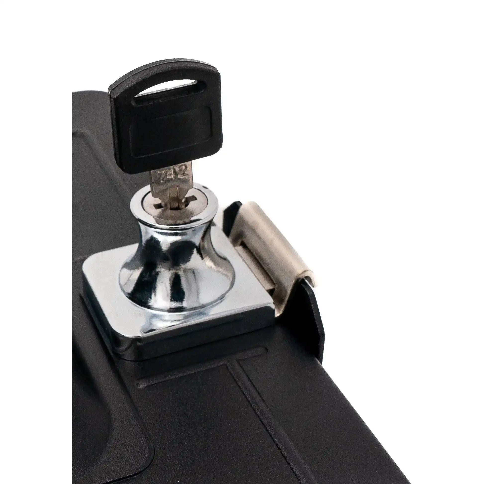Lieferumfang: Im Lieferumfang enthalten sind die abschließbare Halterung, Montagezubehör sowie ein Schlüssel zum Abschließen.