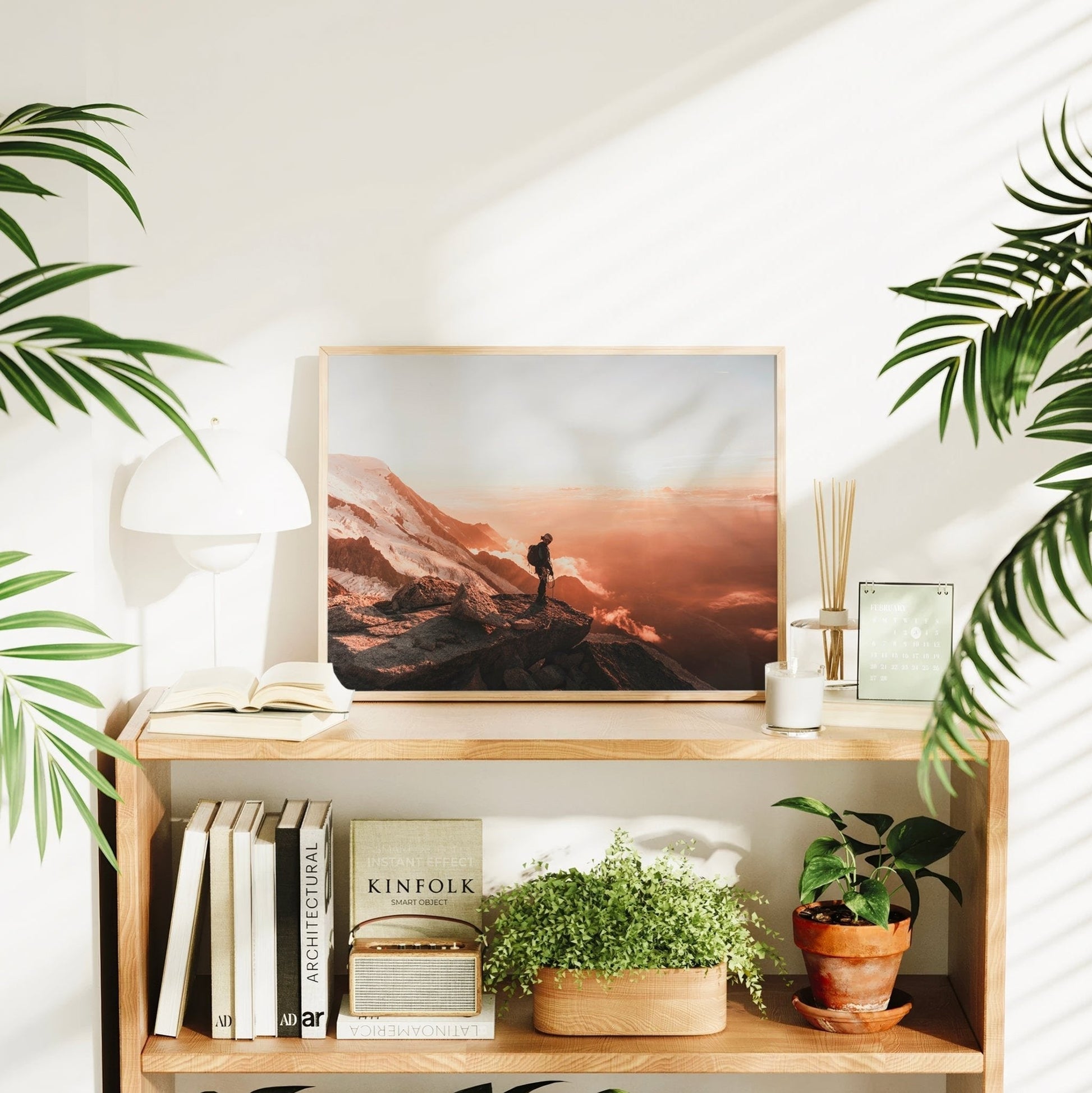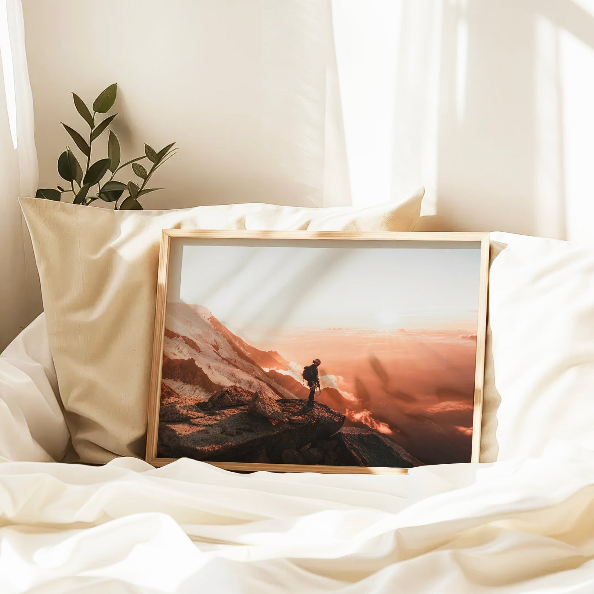 As the sun sets for the day, a lone climber stands bathed in golden light—Chamonix at its most breathtaking. This print captures the perfect alpine moment, where adventure meets serenity.