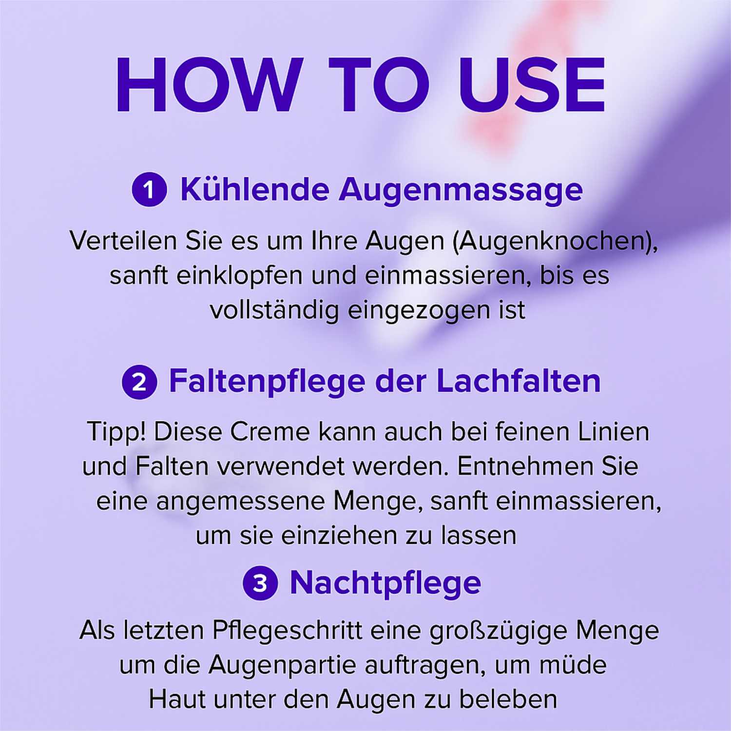 Die Creme ist für alle Hauttypen geeignet – auch für reife oder empfindliche Haut. Ob zur täglichen Pflege oder als gezieltes Treatment gegen dunkle Schatten und feine Linien: Die Creme unterstützt die Haut um die Augen, wirkt erfrischend und sorgt für eine strahlende Ausstrahlung. Sie ist sanft genug für die empfindliche Augenpartie und dennoch wirksam bei ersten Zeichen der Hautalterung.