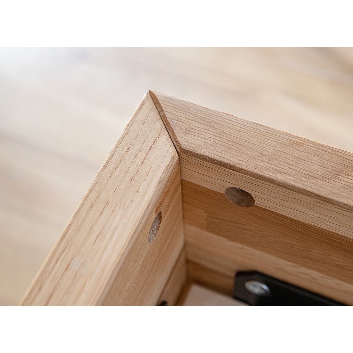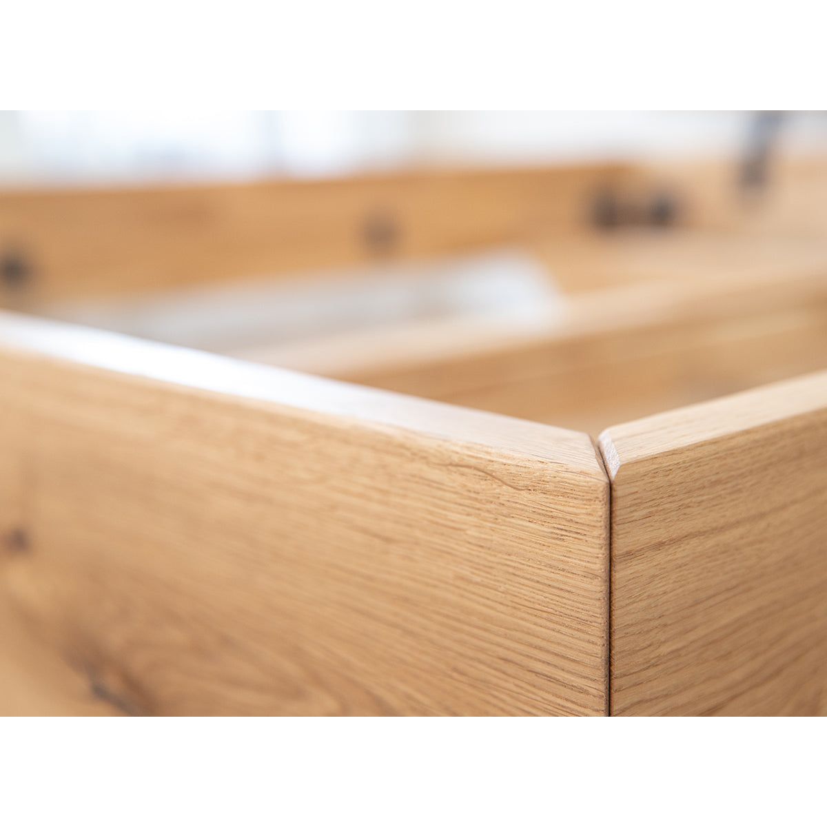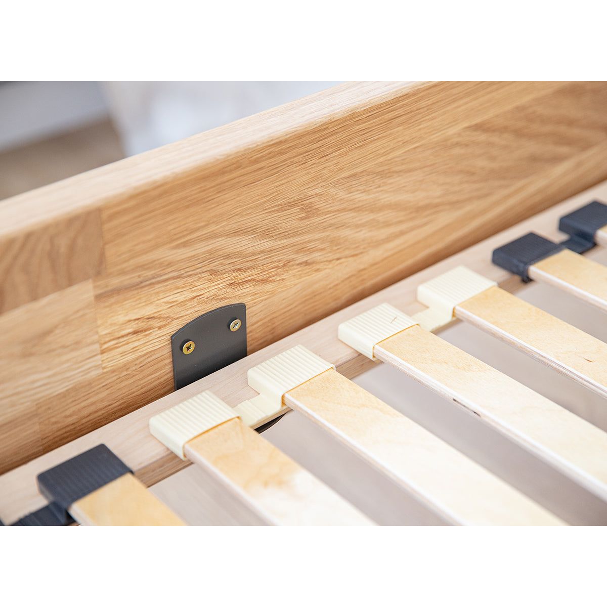 Möbel aus massiver Eiche stehen für Langlebigkeit und Widerstandsfähigkeit gegen alle Arten von Beschädigungen: Verformung, Abrieb, Alterungsprozess. Der größte Teil des Turin-Bettes – das Kopfteil und der Rahmen mit Halterungen – besteht aus Eichenholz, das einen angenehmen, warmen Farbton hat. Eichenholz wird mit der Zeit edler – es erhält eine tiefe, elegante Farbe, die oft noch besser aussieht als am Tag des Kaufs!