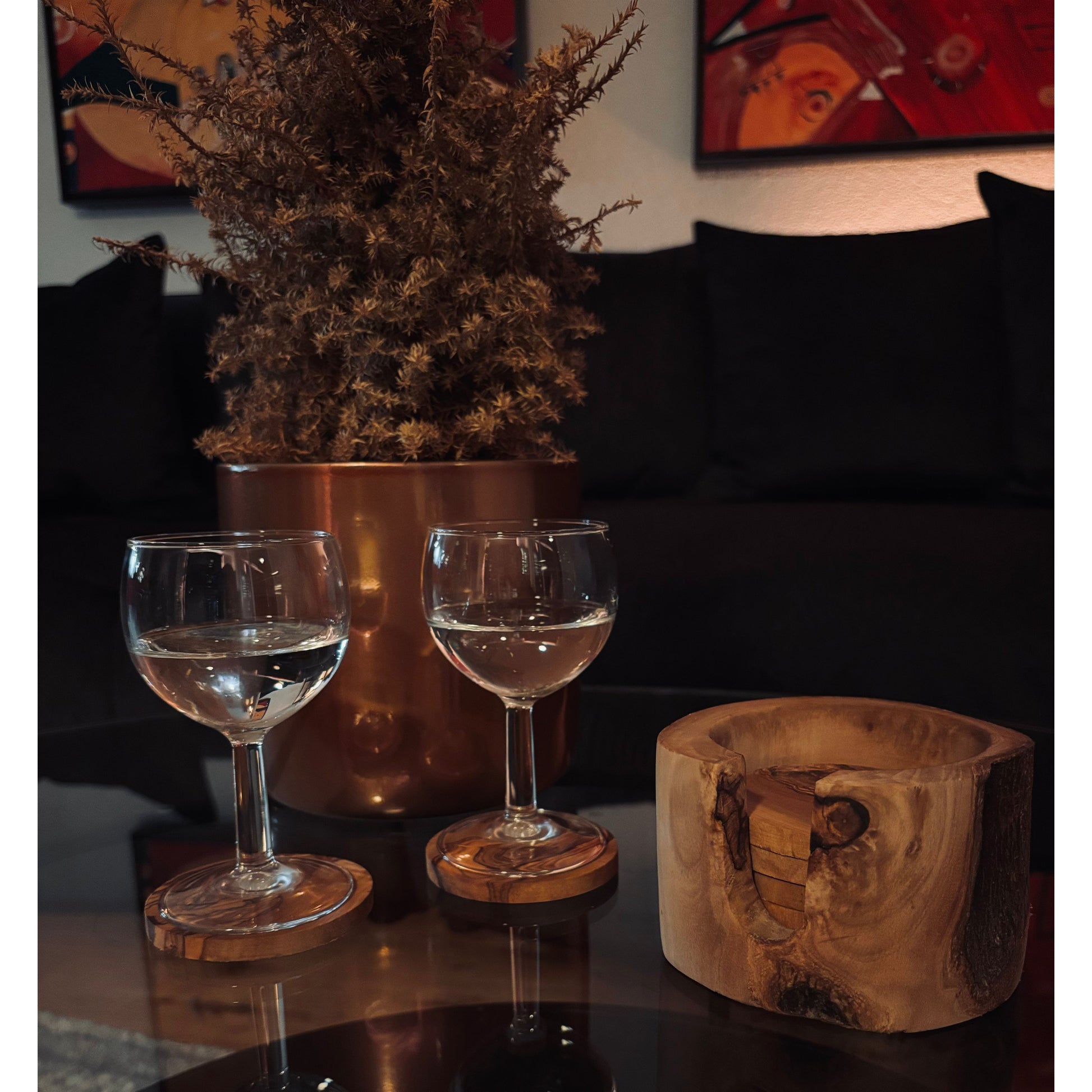 - Set: 6 runde Untersetzer und ein Halter im Olivenholz-Stamm