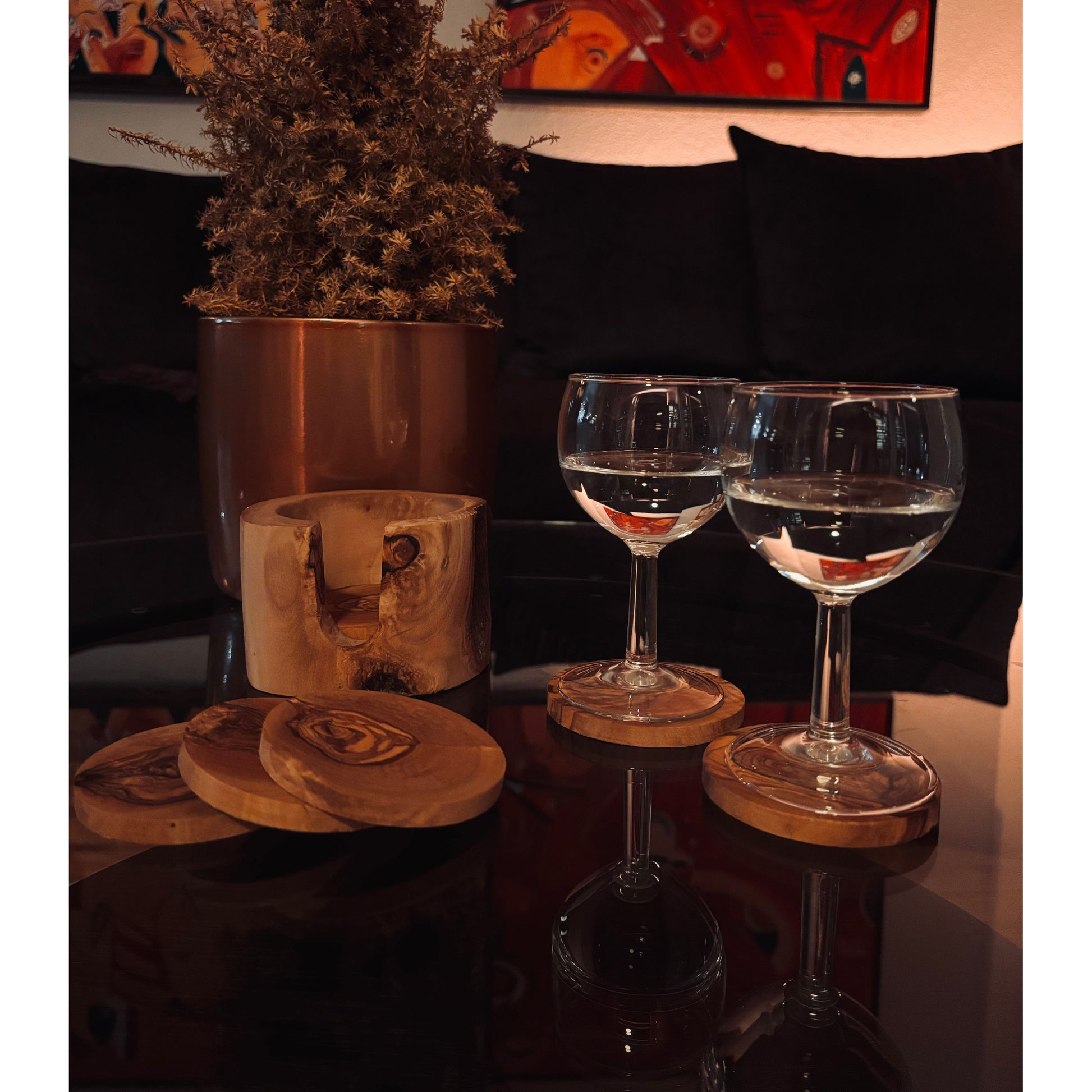 Die robusten Untersetzer schützen Ihre Möbel zuverlässig vor Kratzern und Feuchtigkeit und eignen sich ideal für Gläser, Tassen oder Flaschen. Der Olivenholz-Stamm dient als dekorativer Halter und sorgt dafür, dass die Untersetzer ordentlich und griffbereit verstaut sind, wenn sie nicht in Gebrauch sind.