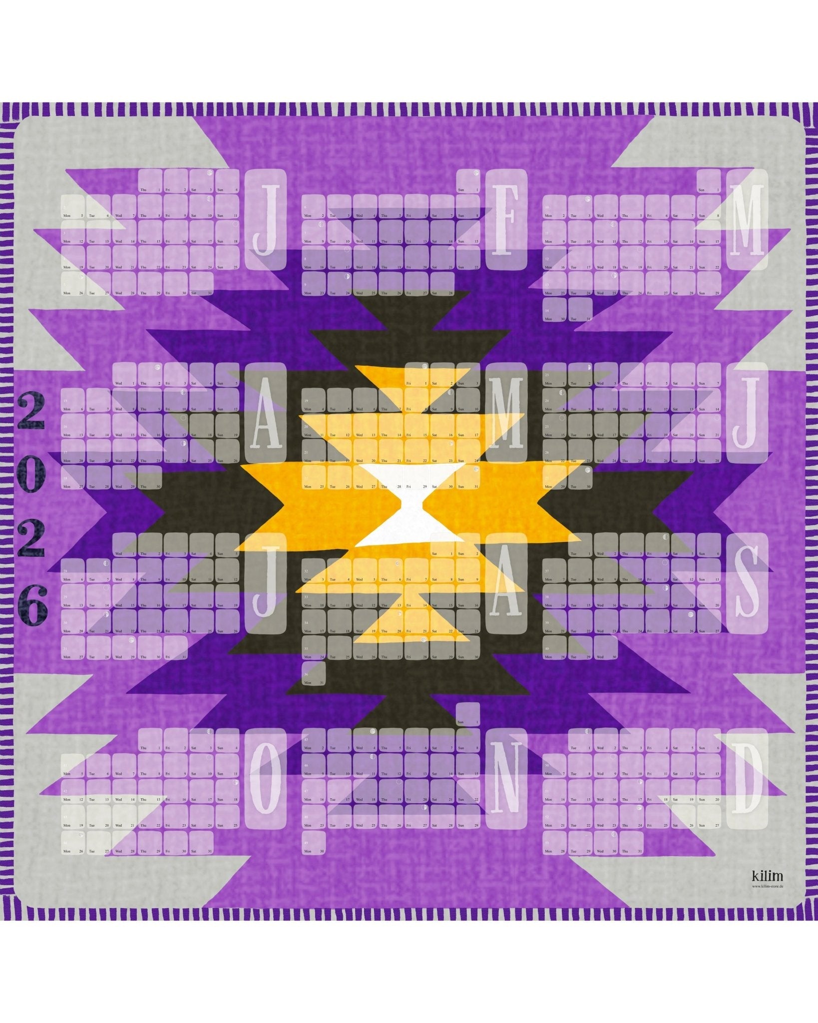Wandkalender Yamka ist wie eine aufgehende, schillernde Blüte. Die weiße Mitte und die zum Rand hin hellere Abstufung verleiht dem 1-seitigen Jahresplaner ein besonderes Leuchten an der Wand. Von Hell- bis Dunkelviolett. Zwischendrinnen ein Schwarz. Blüte: Weiss in Dunkelgelb.