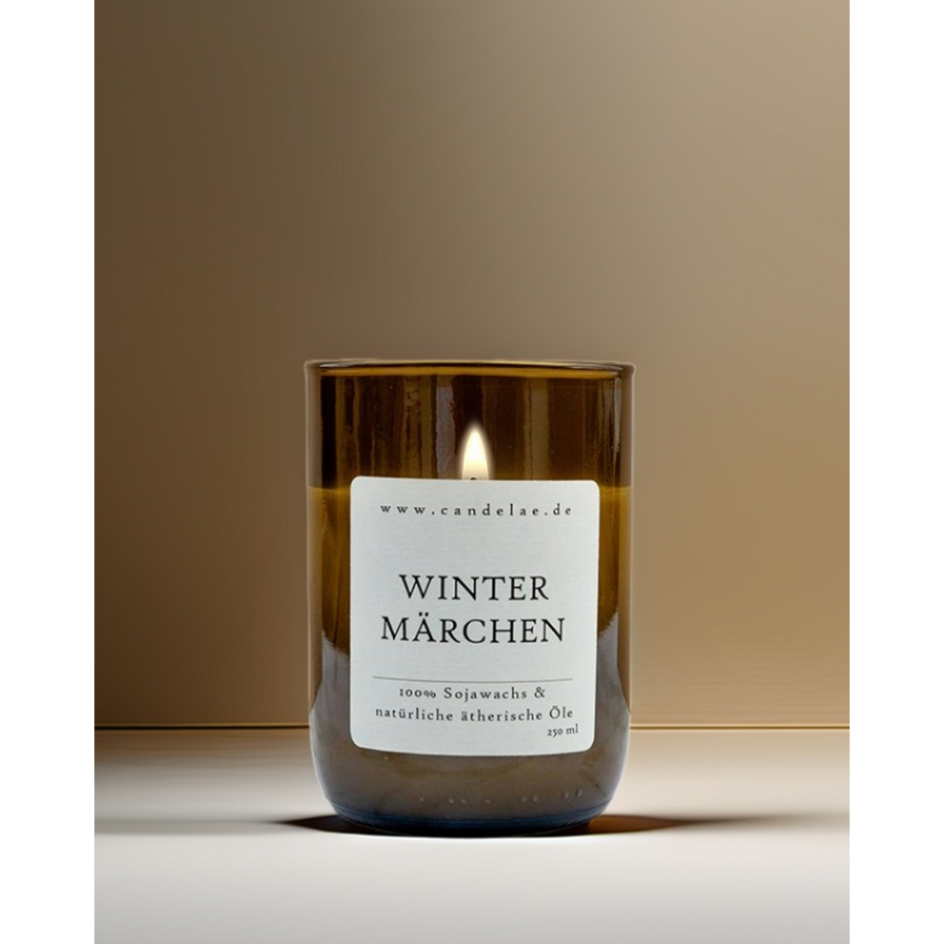 Wintermärchen – eine Duftkerze, die Wärme in kalte Tage bringt. Handgegossen aus 100% Sojawachs, veredelt mit natürlichen ätherischen Ölen und abgefüllt in ein upgecyceltes Glas aus einer Weinflasche. Diese vegane Kerze verbindet Nachhaltigkeit mit zeitloser Eleganz.