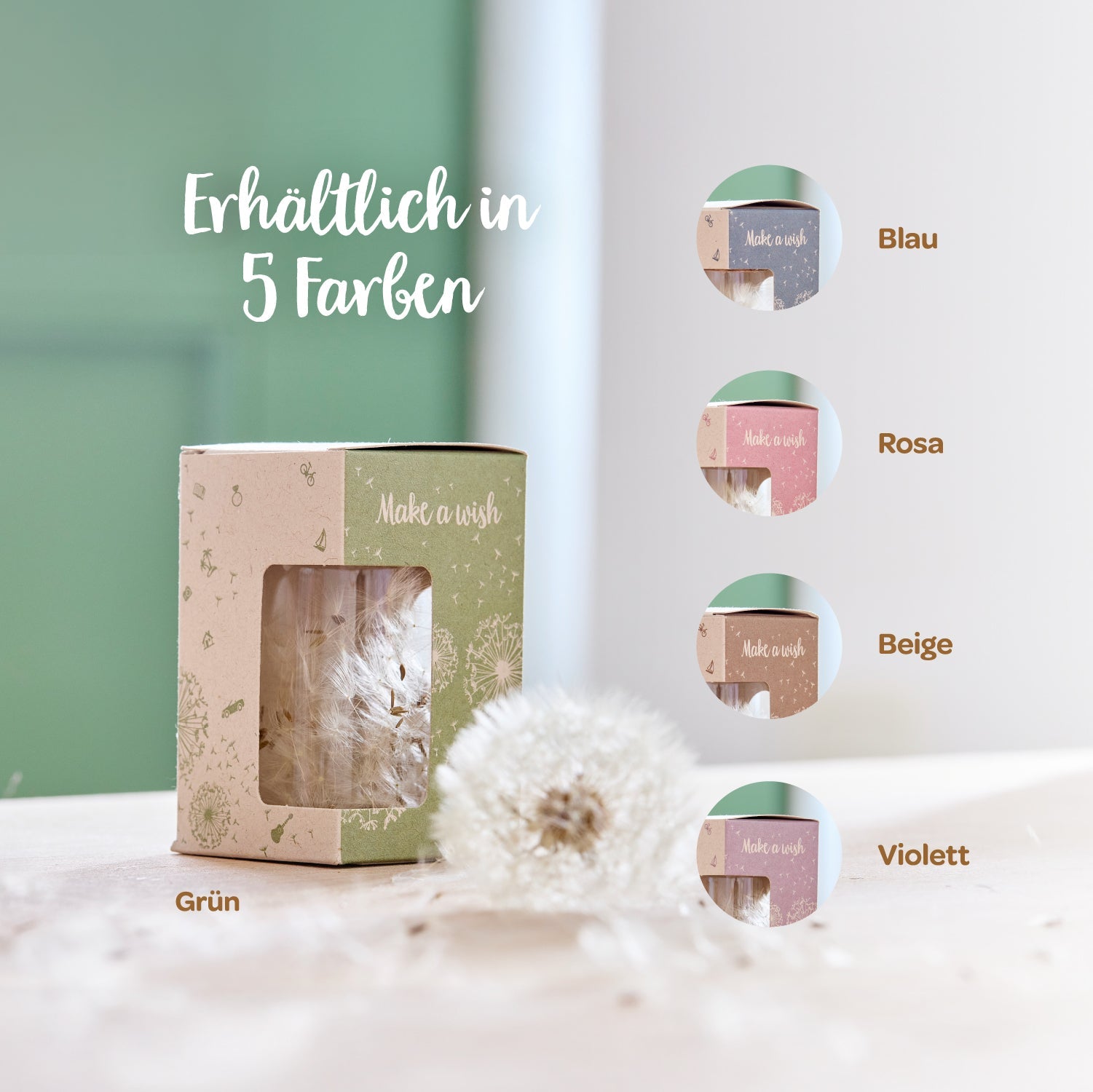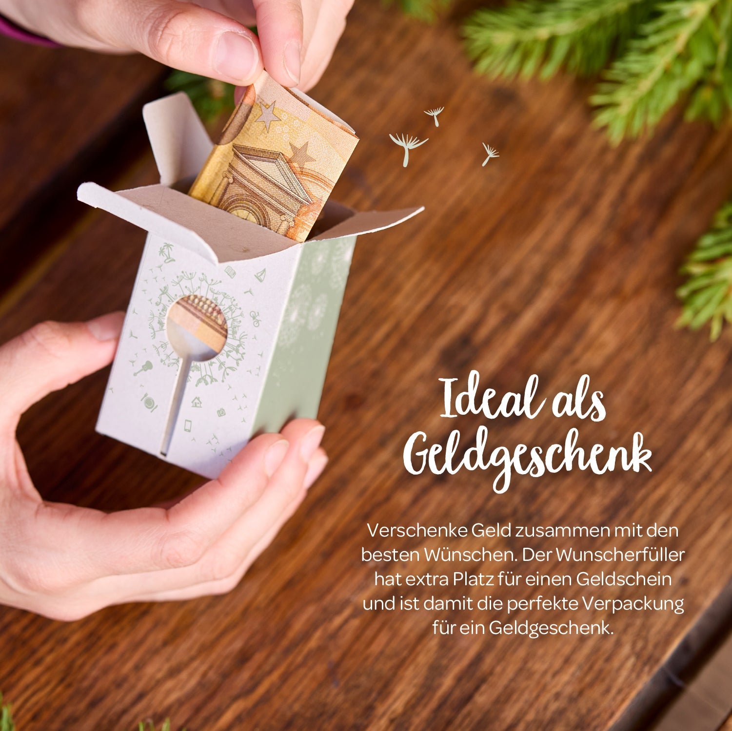 Geldgeschenk witzig verpacken: Verschenke Geld zusammen mit den besten Wünschen. Die Wunscherfüller-Pusteblume Verpackung hat extra Platz für Geldscheine und ist ideal zum Geld, Wünsche und Glück verschenken.