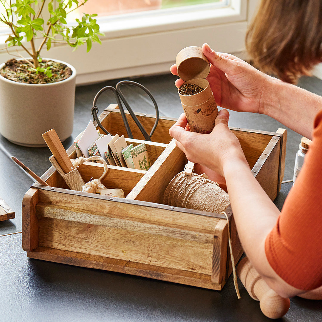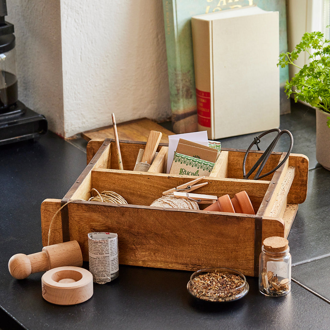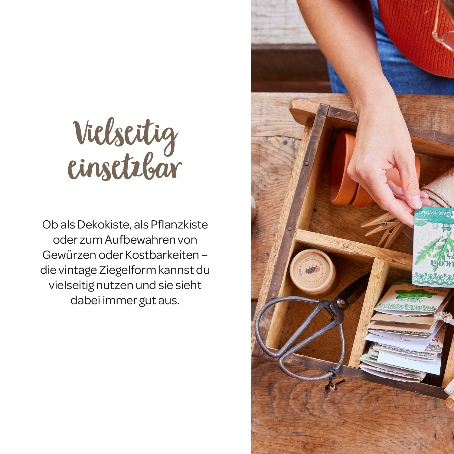 Vielseitig einsetzbar: Ob als Dekokiste, als Pflanzkiste oder zum Aufbewahren von Gewürzen oder Kostbarkeiten - die vintage Ziegelform mit vier Kammern kannst du vielseitig nutzen und sie sieht dabei immer gut aus.