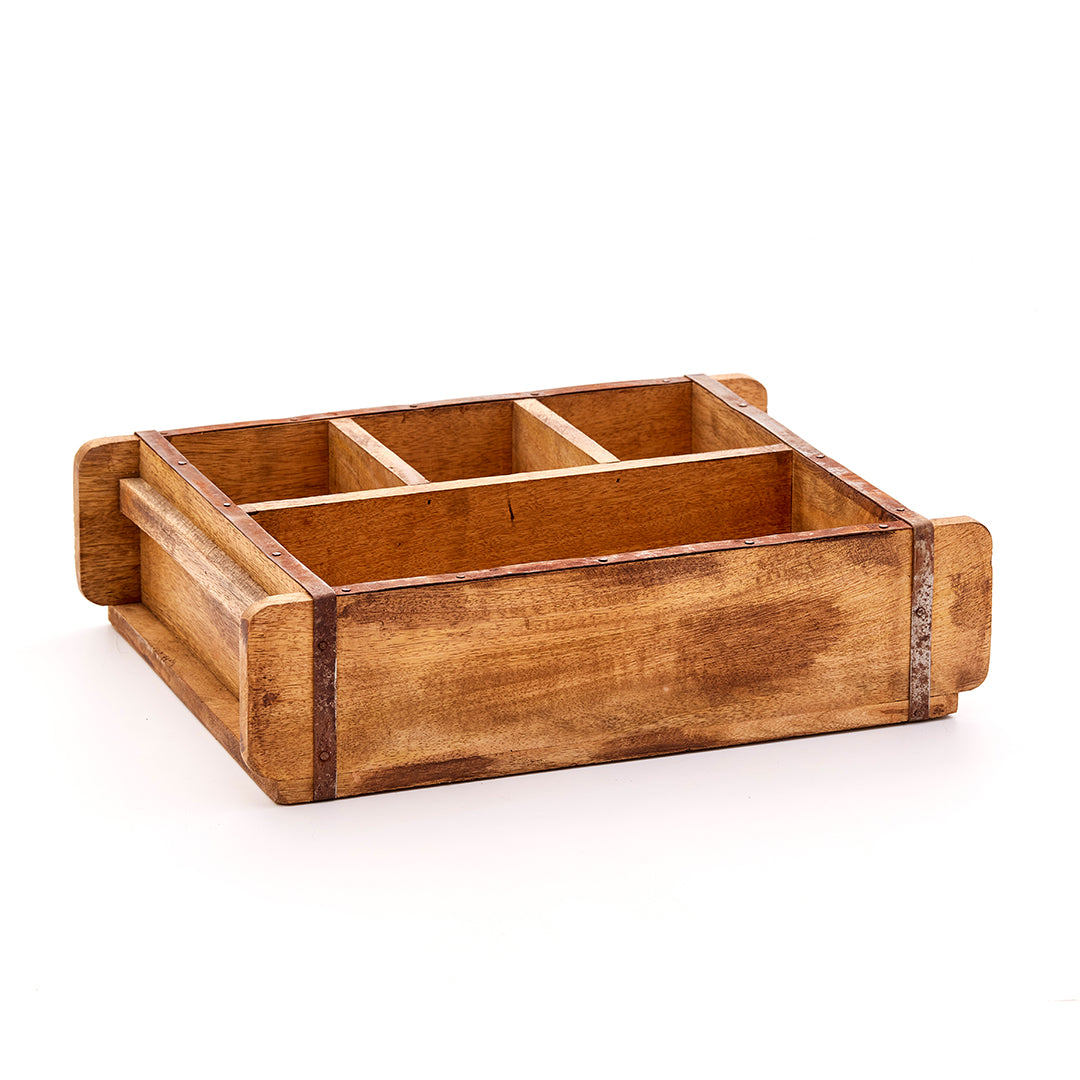 Details: 4 Kammern (1 große, 3 kleine) | Länge 37 cm, Breite 27,5 cm, Höhe 9,5 cm | Material: Holz mit Metallbeschlägen